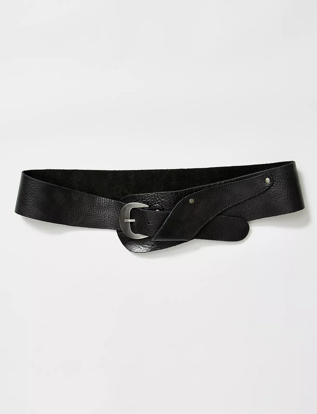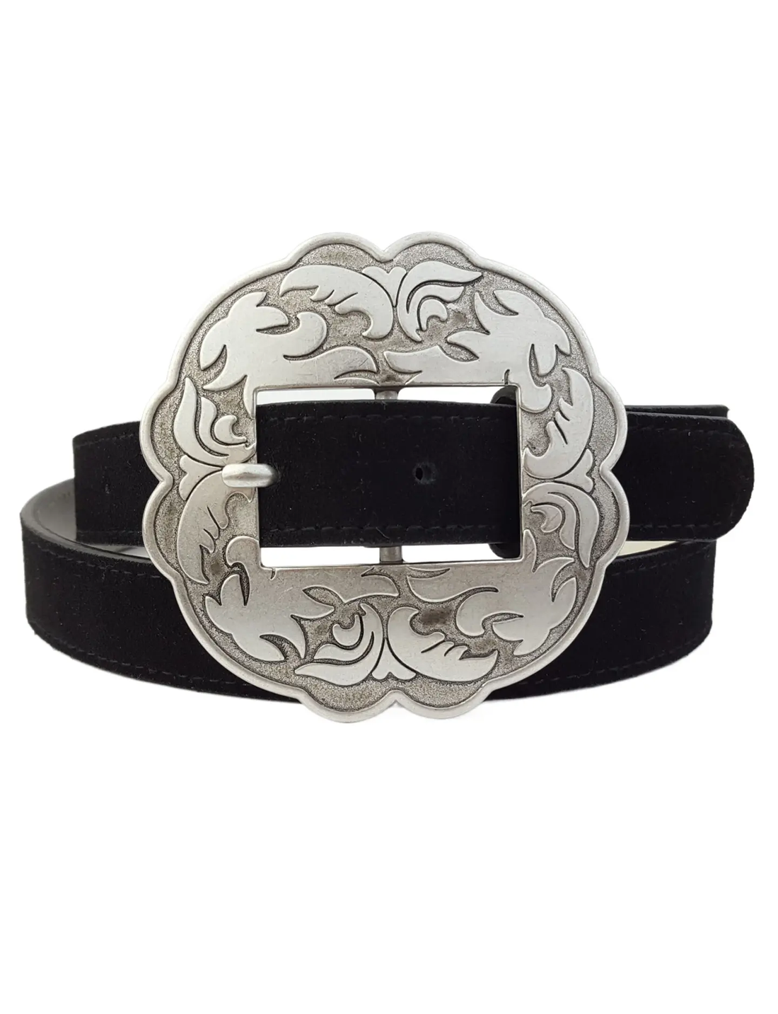 Floral Buckle Belt, Black Leather Suede