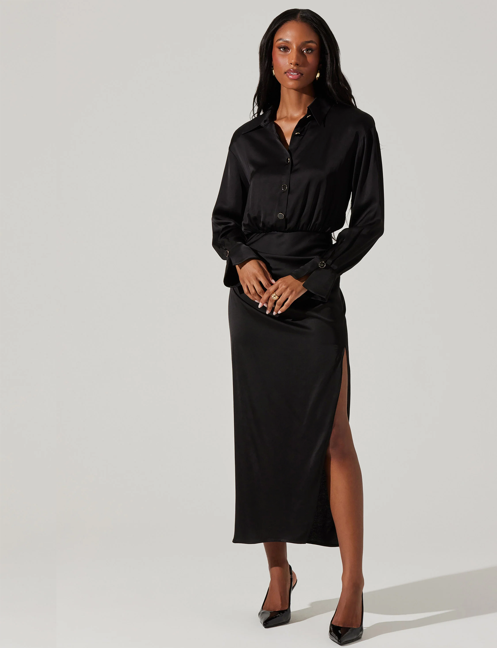 - Long sleeve, satin midi shirt dress