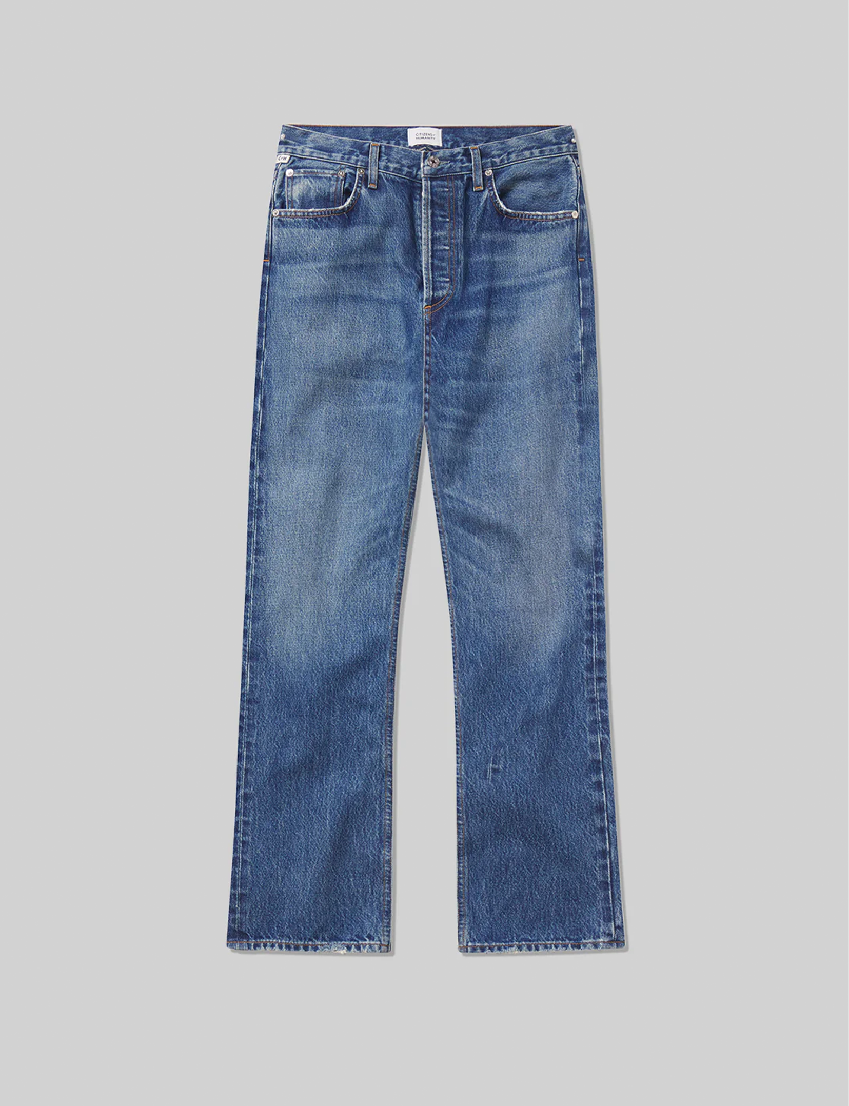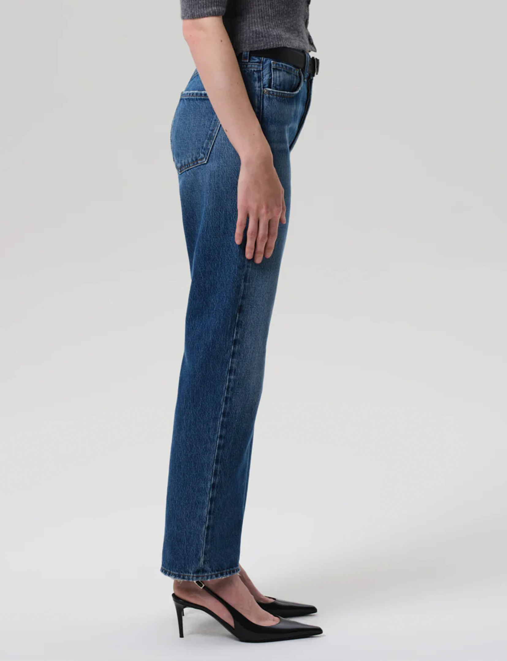 The ‘Blaine’ is a vintage-inspired straight leg with a high rise and ankle-length inseam for a flattering, clean-lined silhouette. The ‘Chaya’ wash is a softly worn medium-light indigo with subtle fading, marbling, and whiskering. Crafted from rigid regenerative cotton with a soft hand, it’s an everyday essential—style with a slim tee or oversized blazer for effortless contrast.
