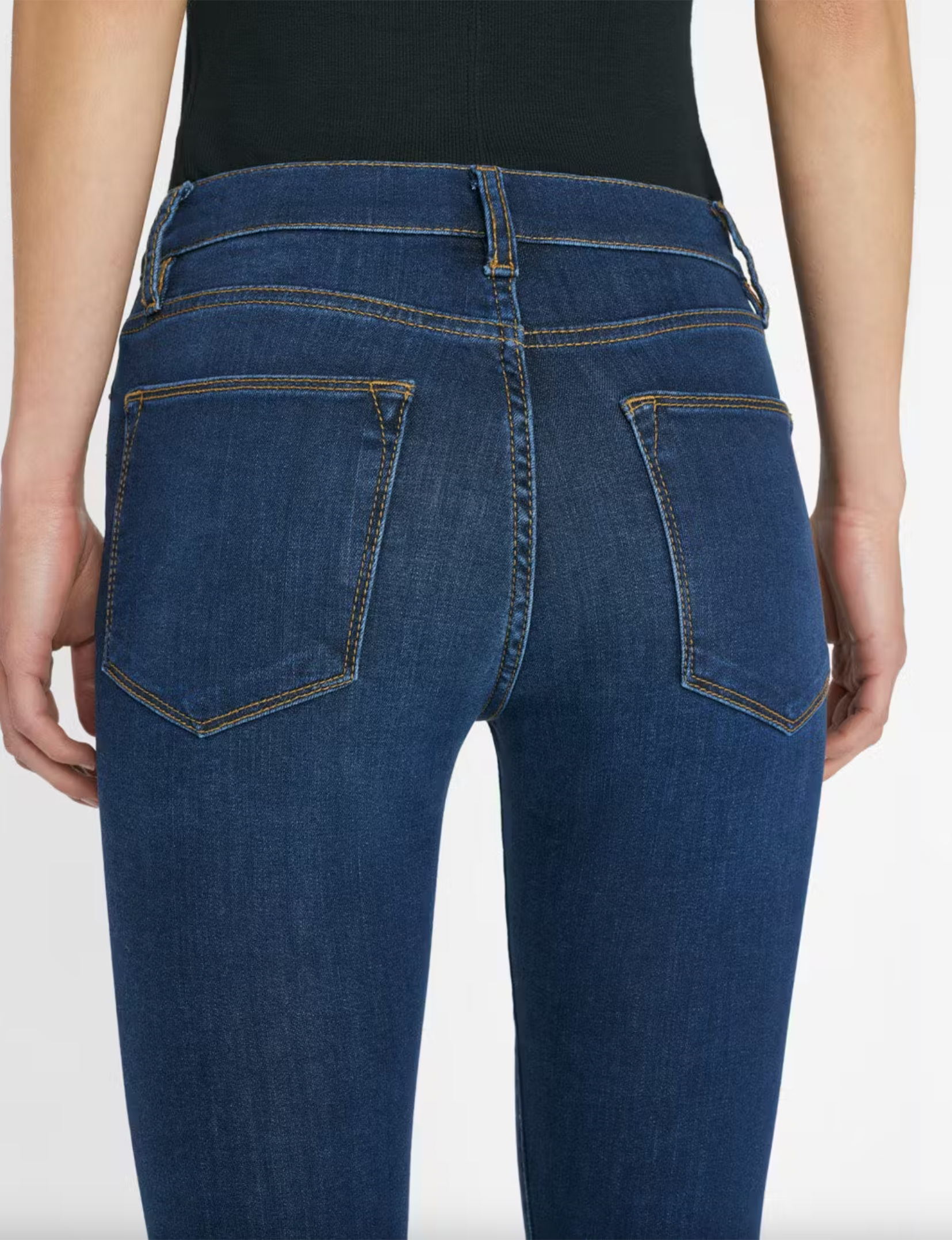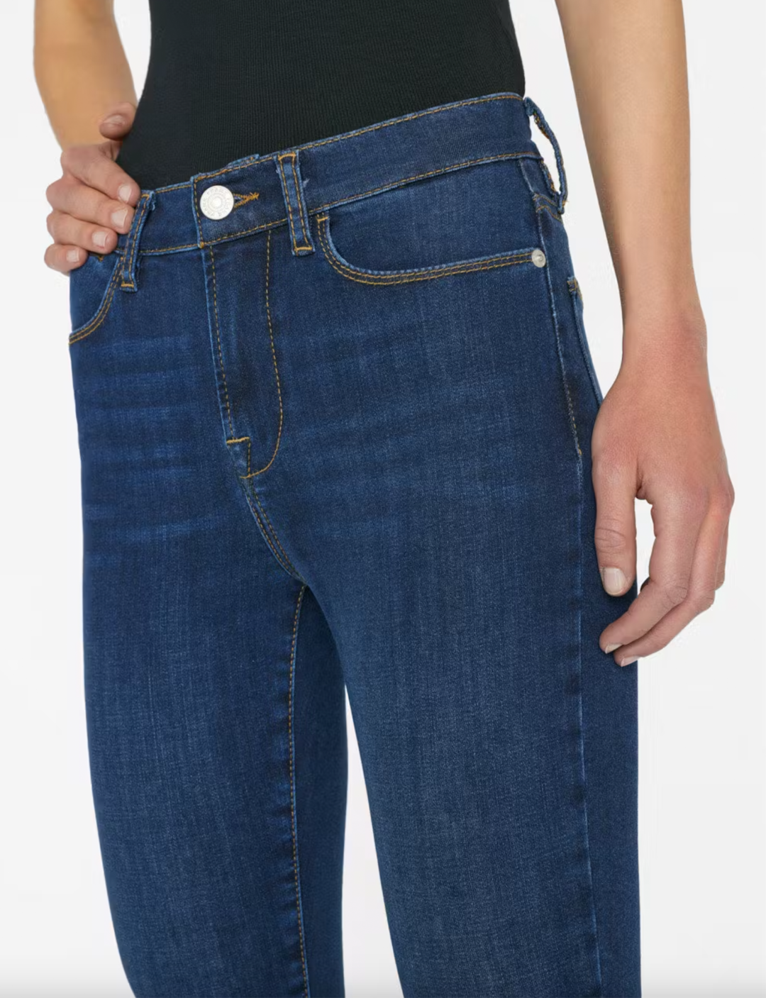 A FRAME signature jean with a form-fitting silhouette that sits high at the waist, now available with peekaboo side ankle slits on the outseam. Crafted from a sustainable stretch cotton blend with the softest hand.