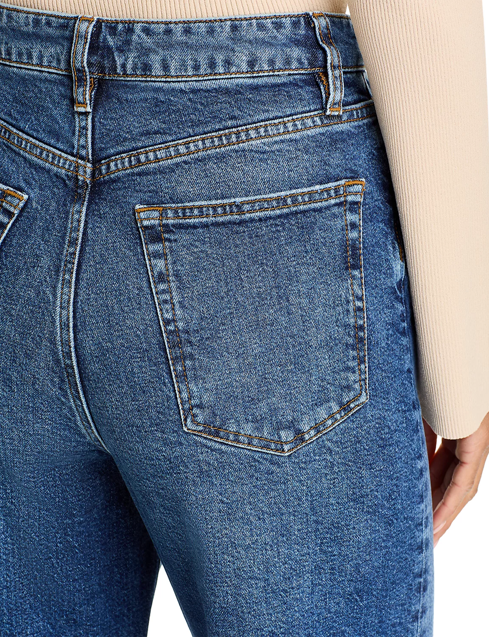 - Zip fly with button closure, five-pocket silhouette