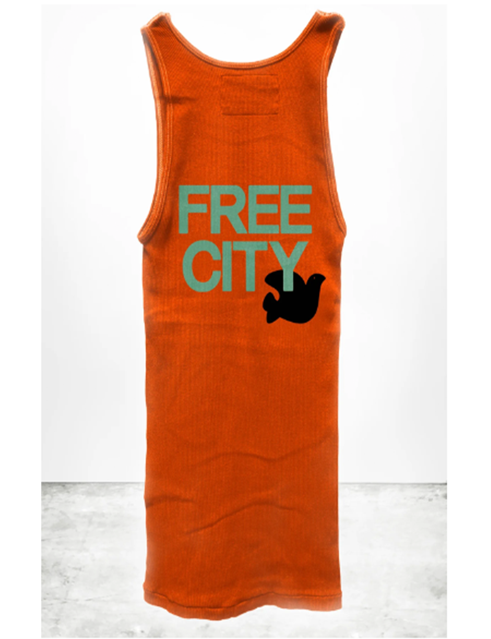 Unisex FREECITY RTU/1999 SUPERVINTAGE rib tank in surplus with classic "FREECITY" print on back and "FREECITYDOVE" print on chest.