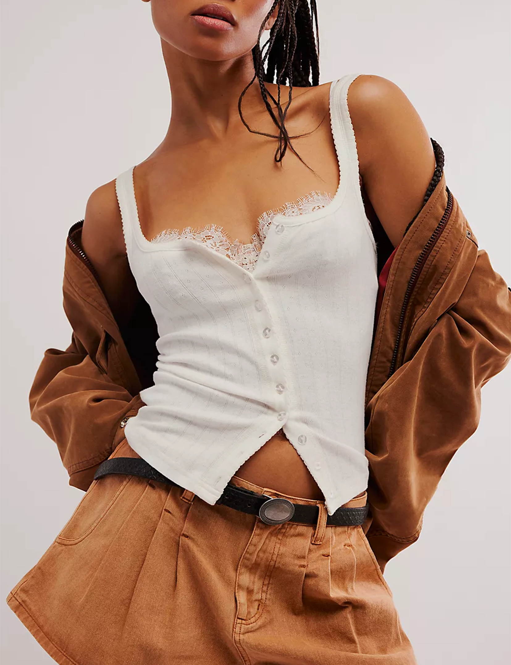Features: Soft fabrication, lightweight design, wide square neckline, pointelle knit, scoop back, button-front closure, picot trim