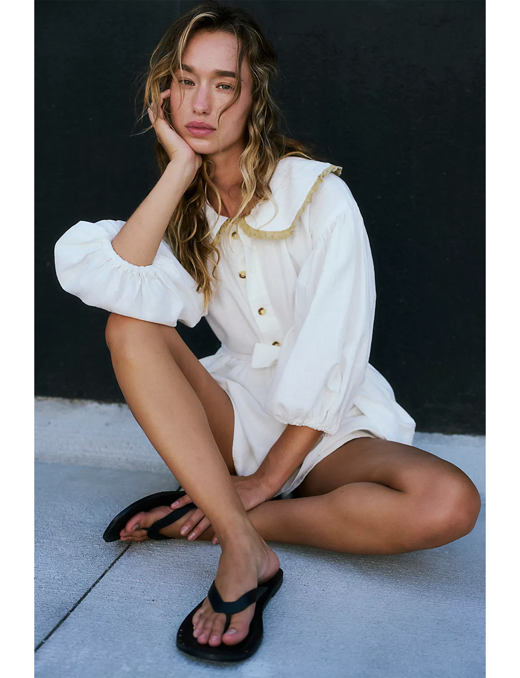 Features: Slip-on style, backless design, leather uppers, thong straps, stud details outlining footbed, flat sole
