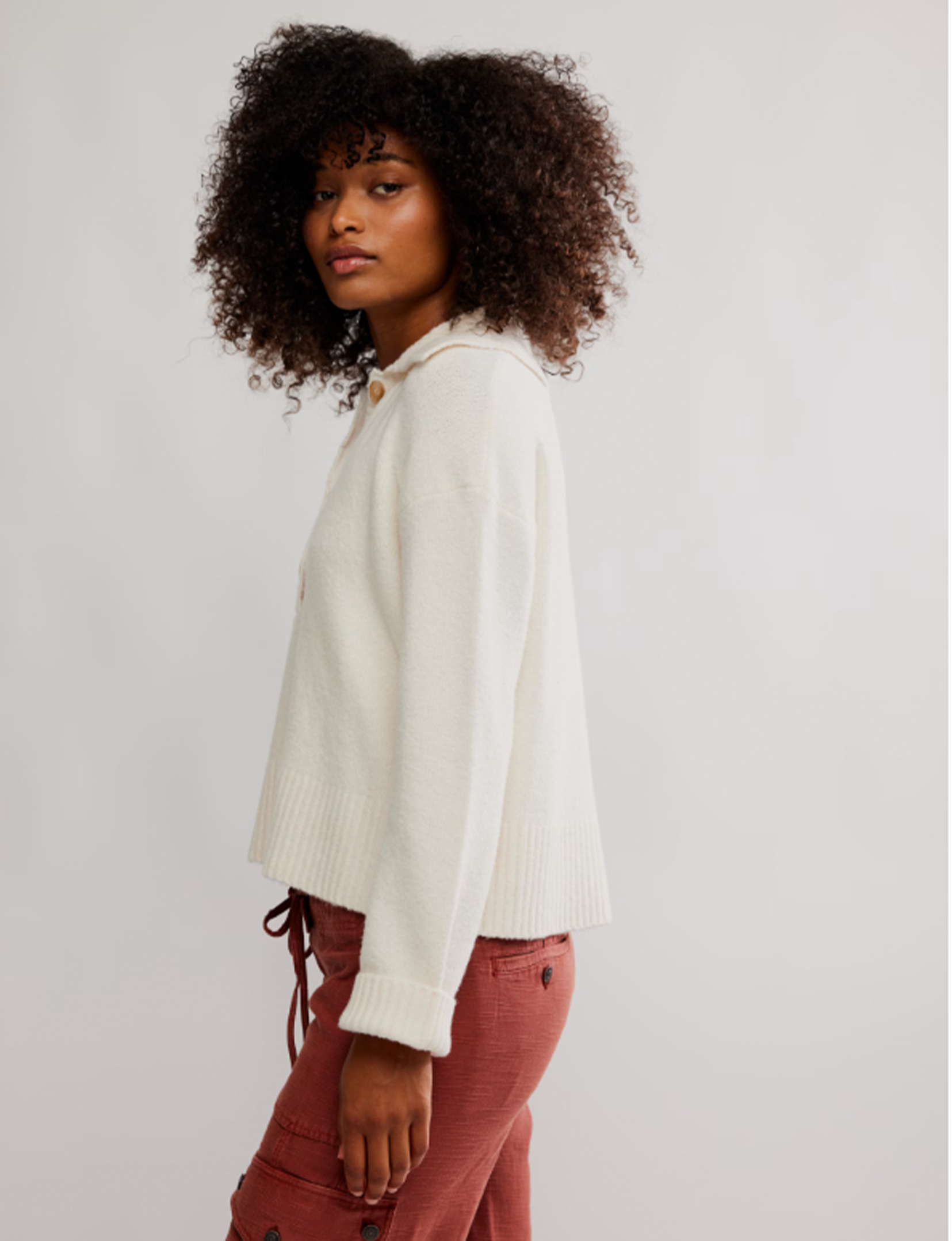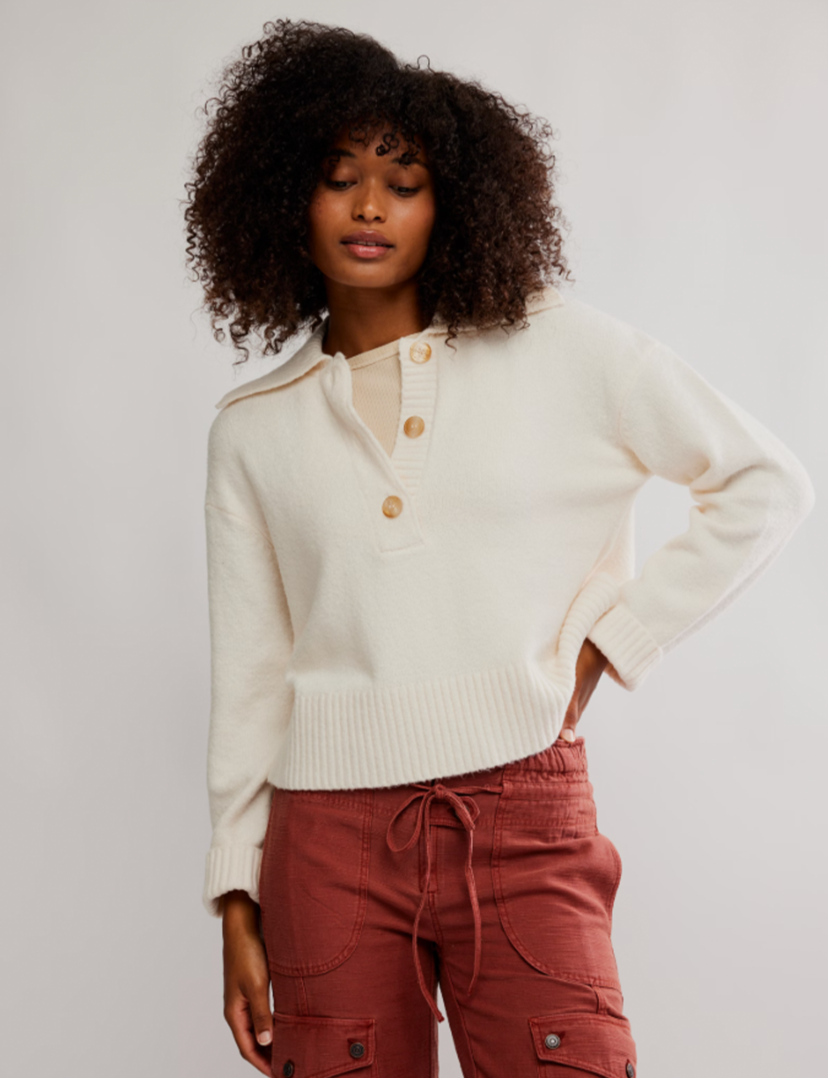 The definition of cozy, this sweater features a classic polo-inspired silhouette, a cotton-blend knit fabrication, and charming tortoise shell buttons.