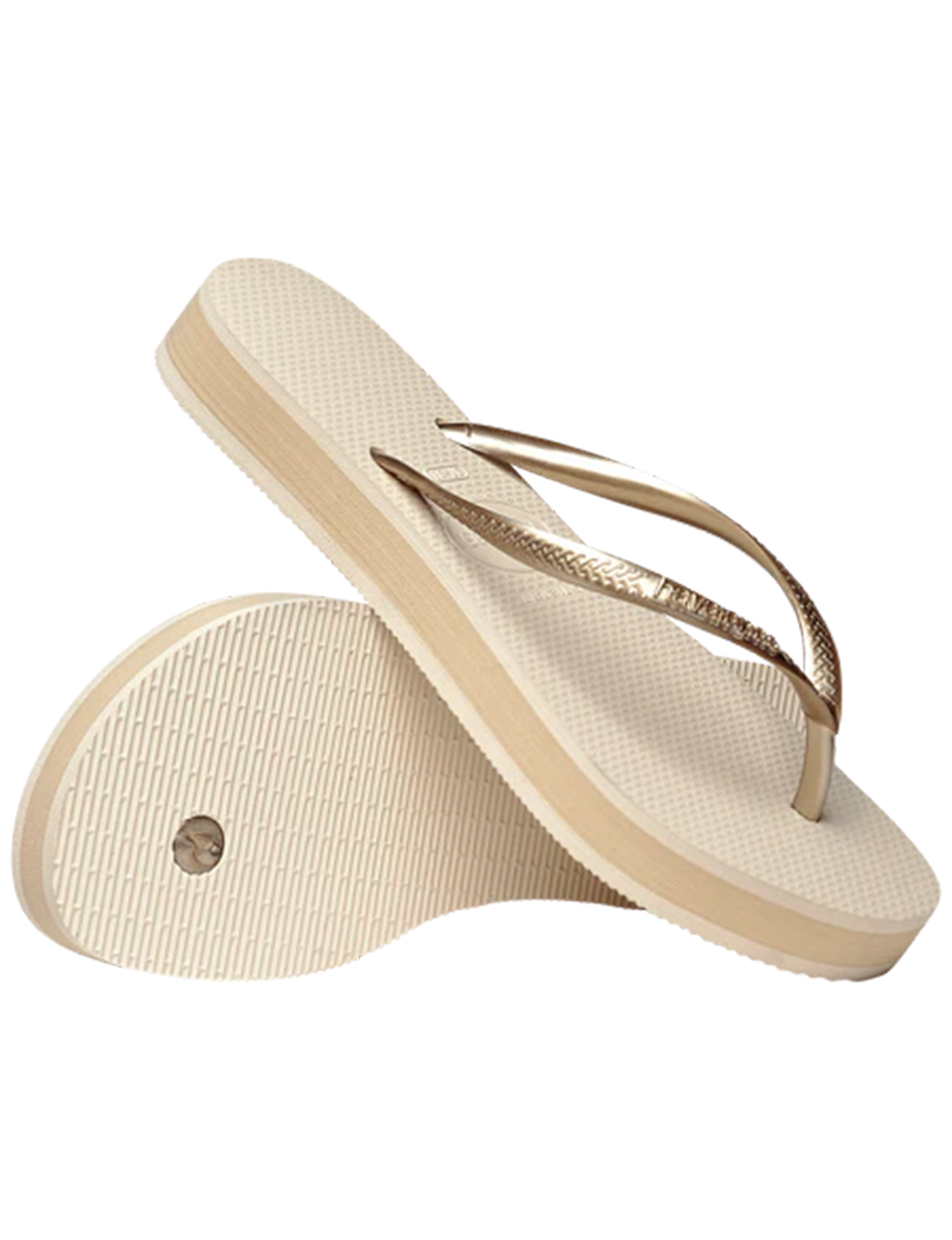 Elevate your look without sacrificing comfort in the women's beige Slim Flatform flip flop. Featuring the best-selling Slim shape with a subtle and stylish boost of height. This style features a heeled flip flop, for an elevated platform look!