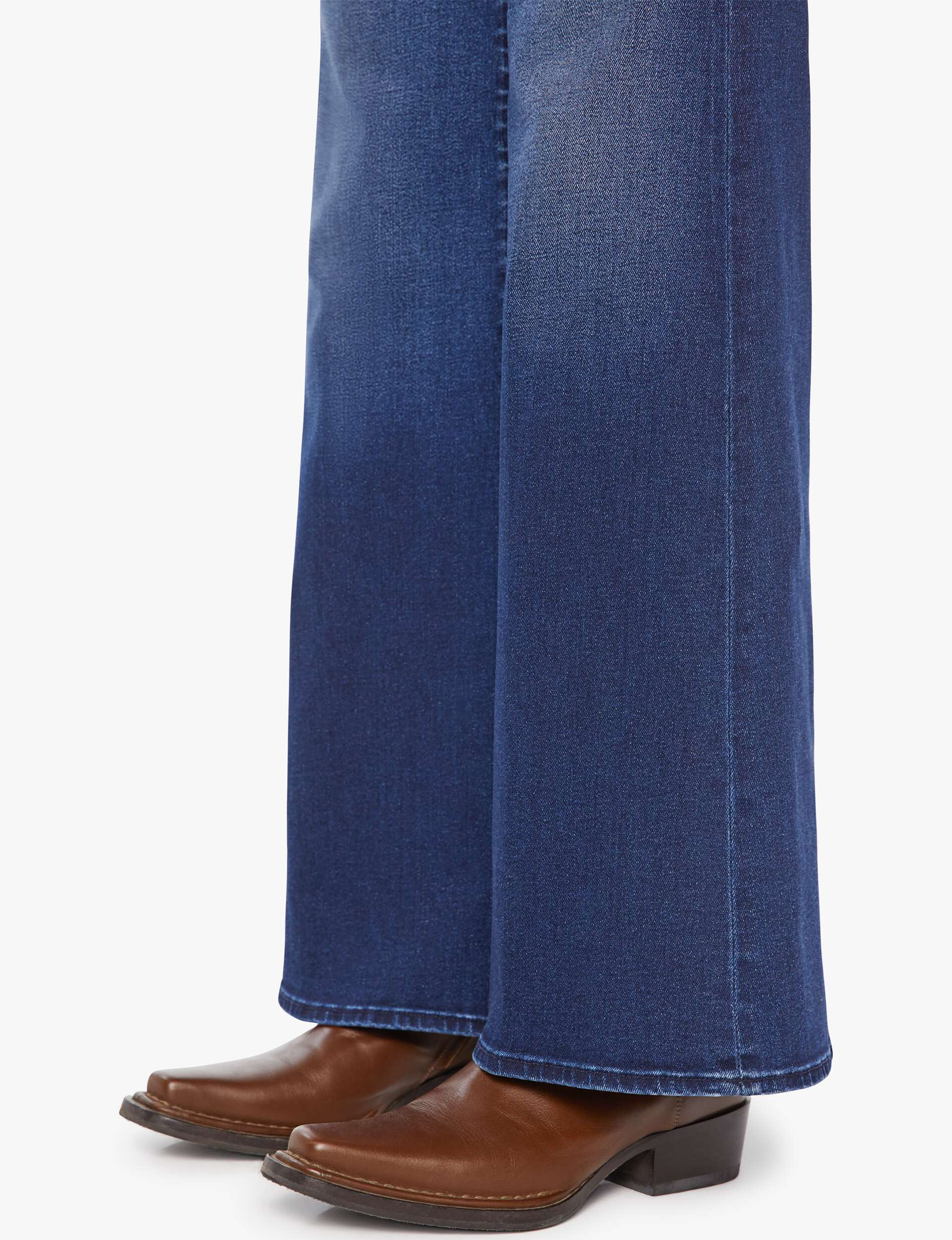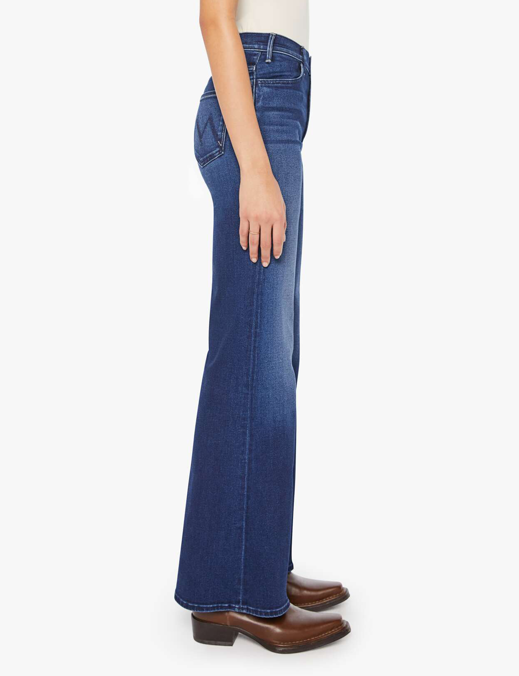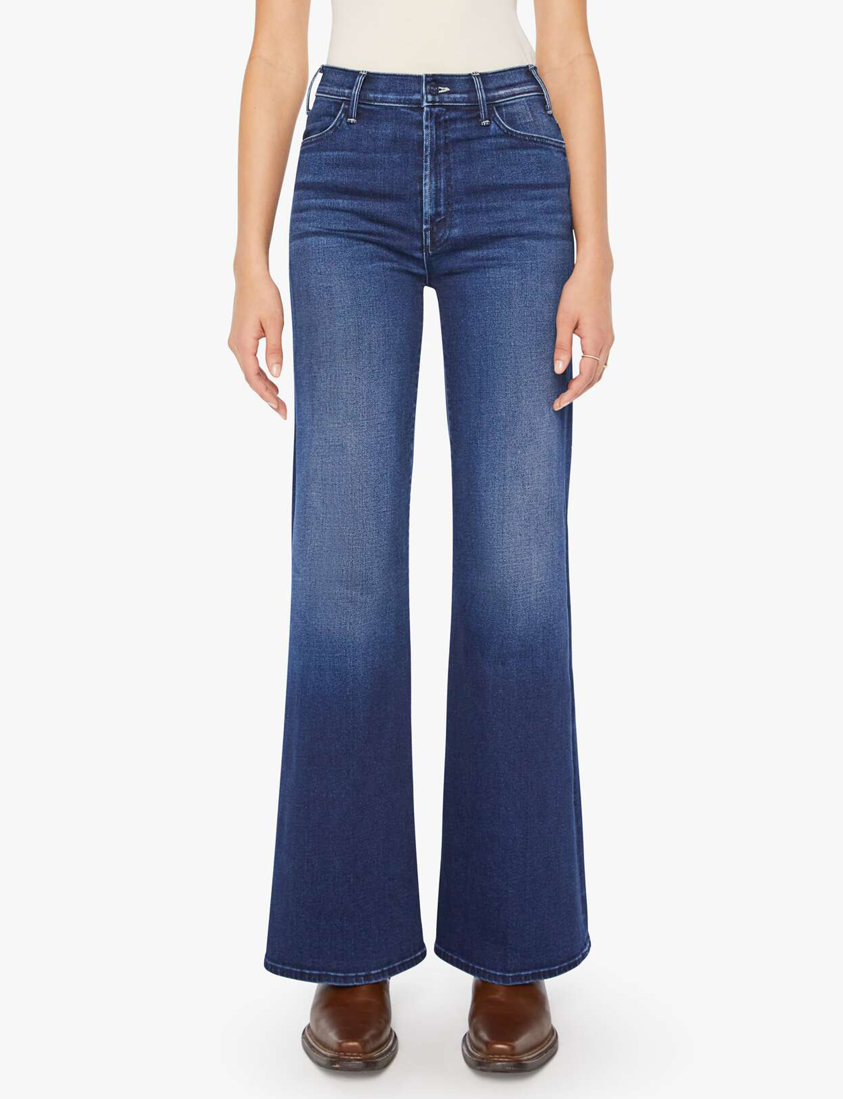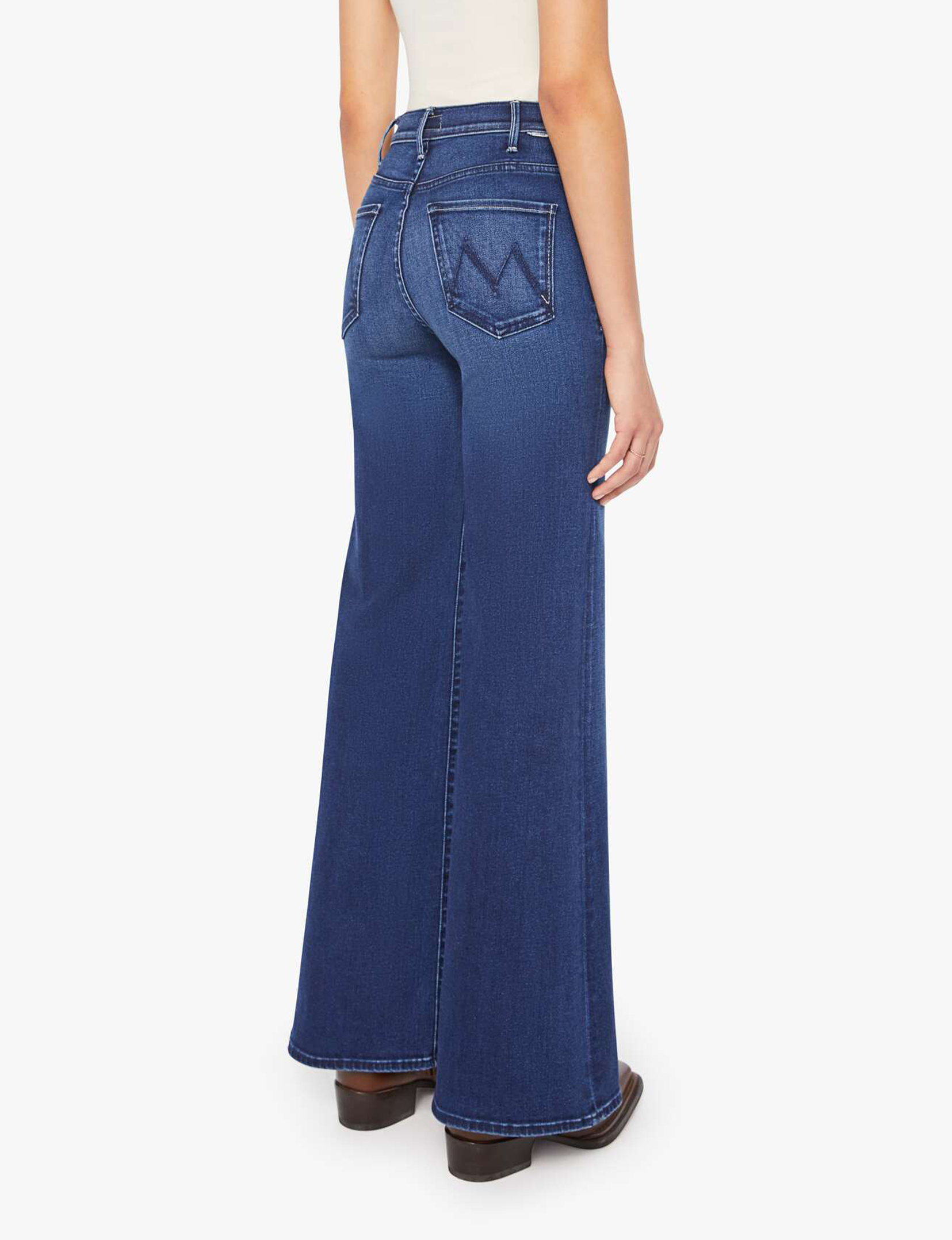 Team spirit. 70s-inspired wide leg jeans with a high rise, 33-inch inseam and a clean hem. Made from stretch denim, Homecoming High is a dark blue with subtle whiskering and fading at the knees.
