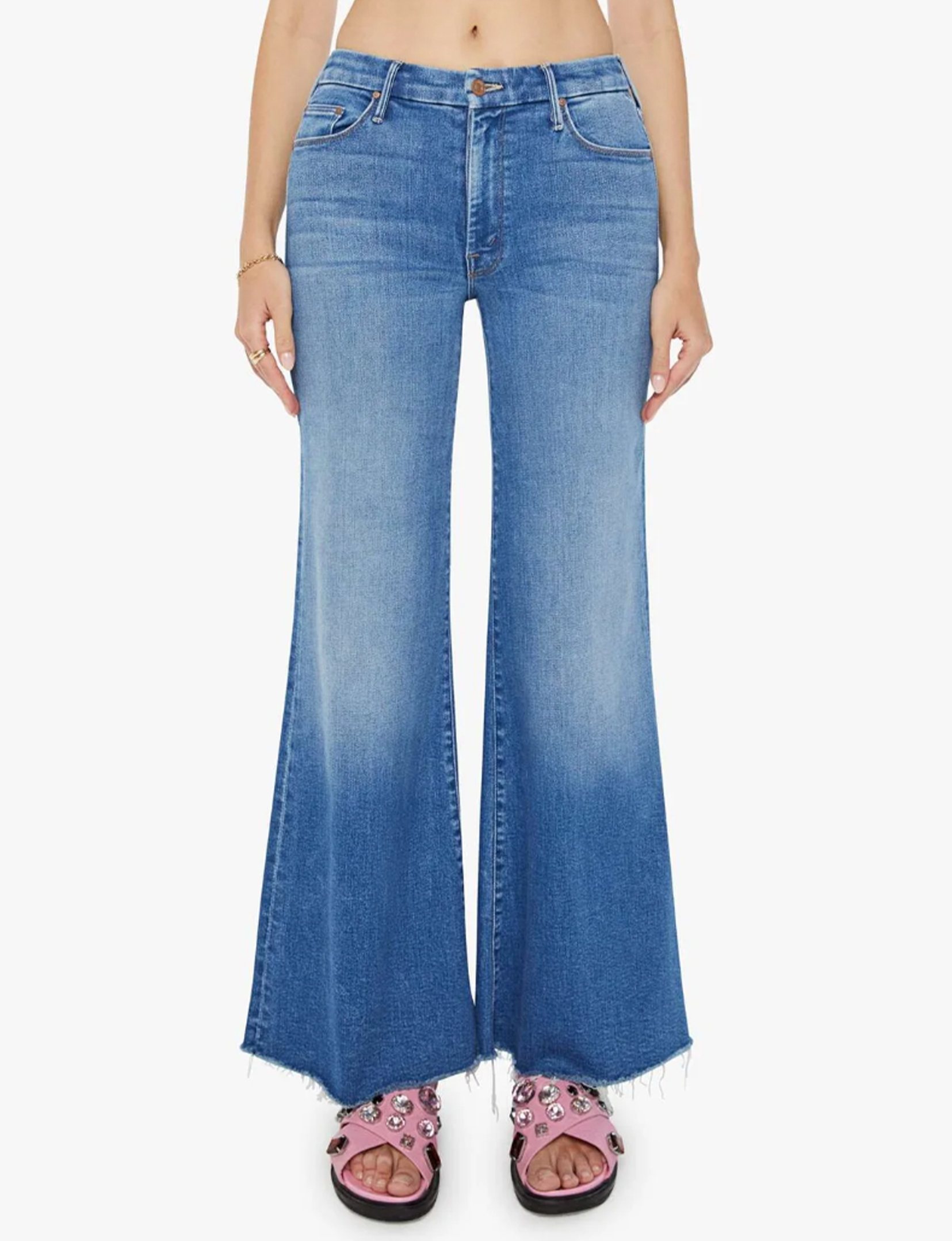 TGIF. This iconic high-waisted wide leg has a 31-inch inseam and a frayed hem. Cut from stretch denim, Work Hard Play Hard is a mid-blue wash with subtle whiskering and fading at the knees.