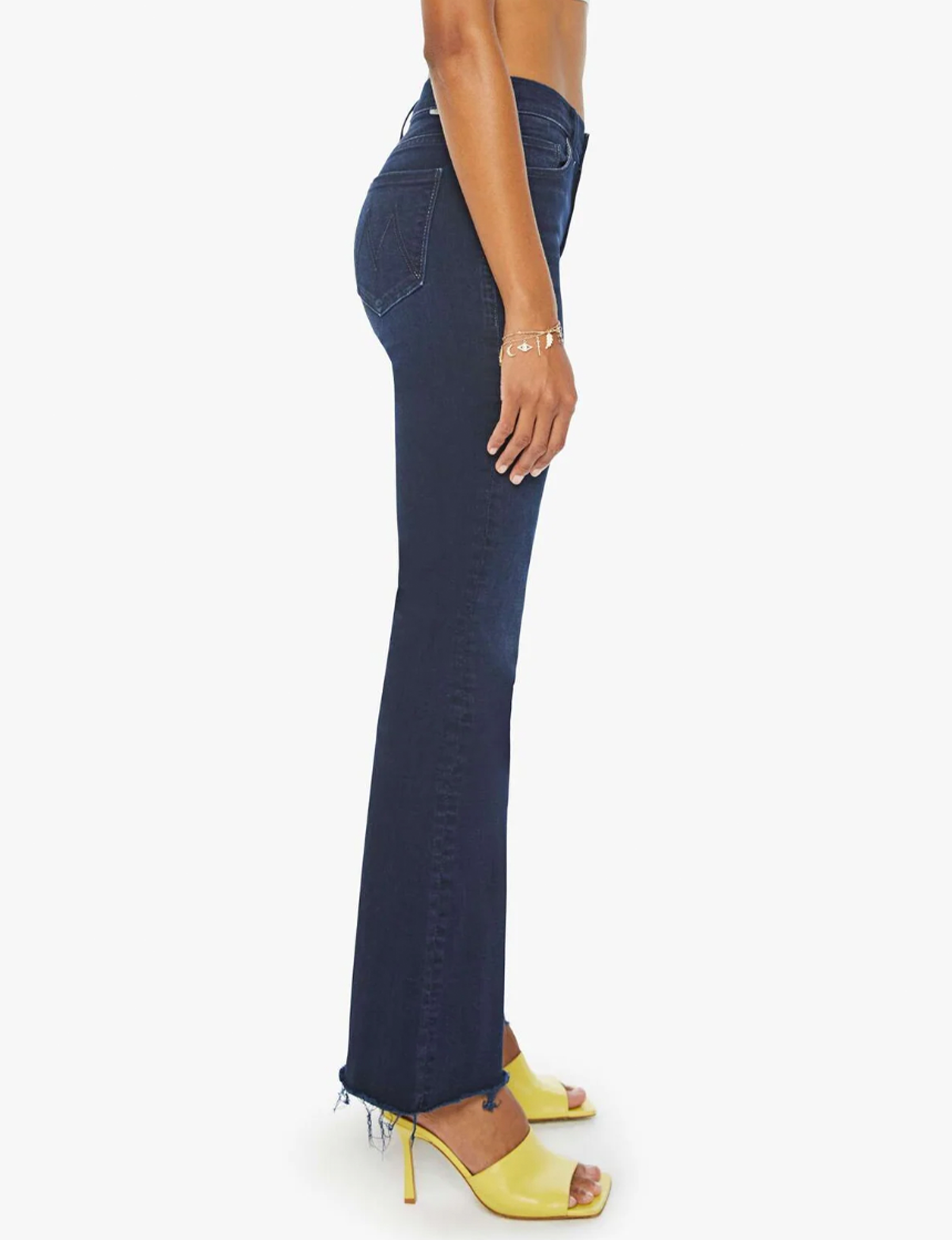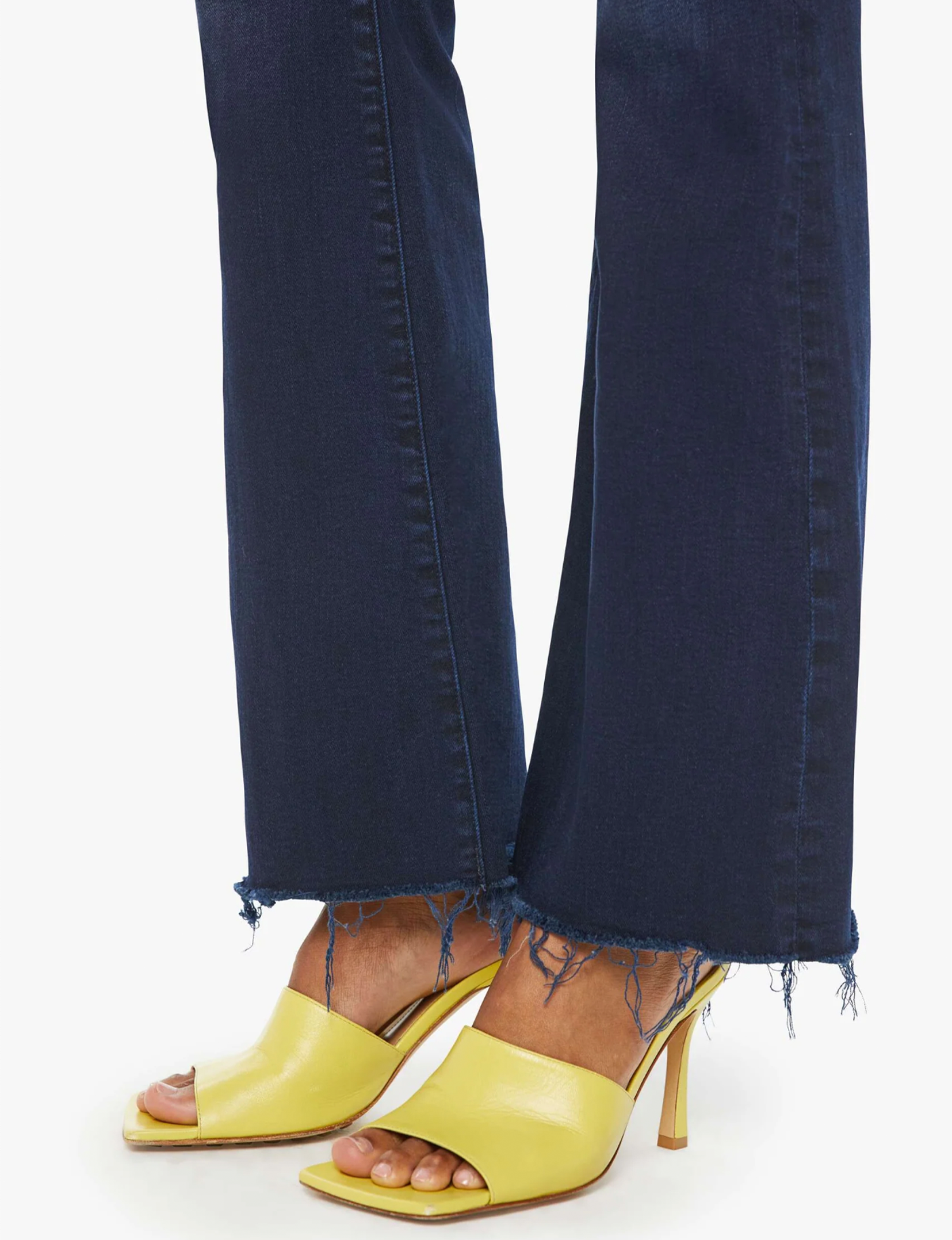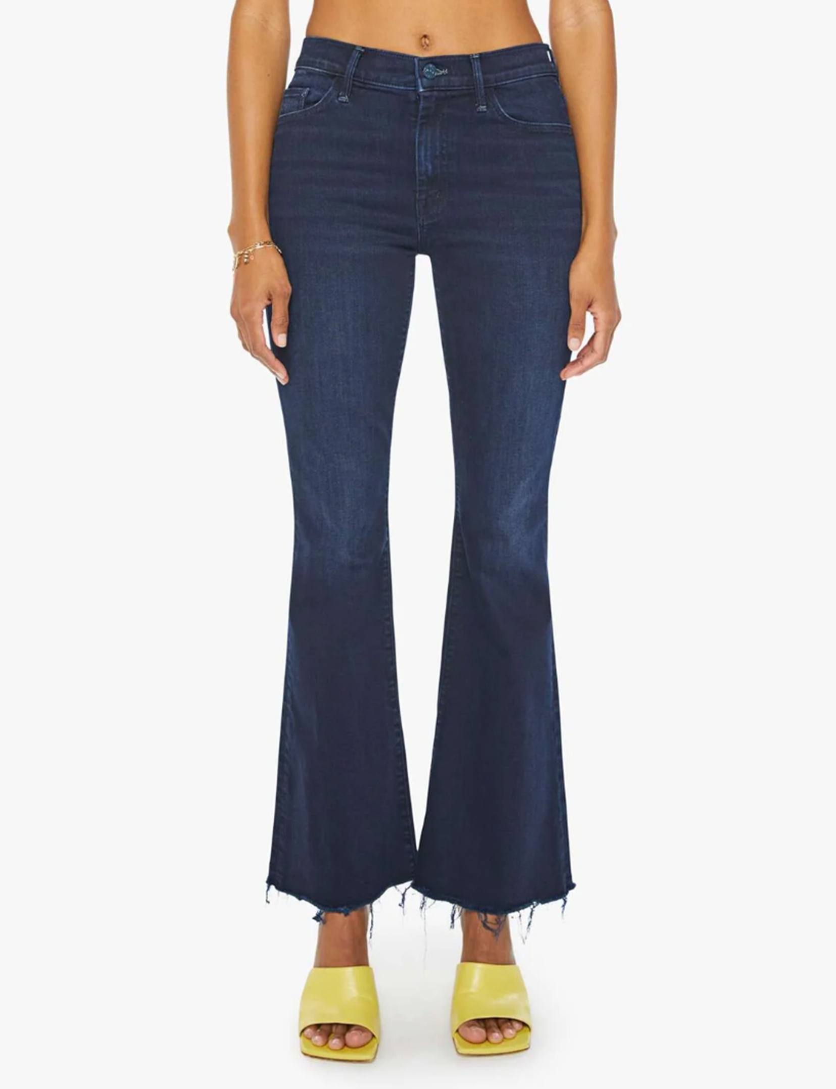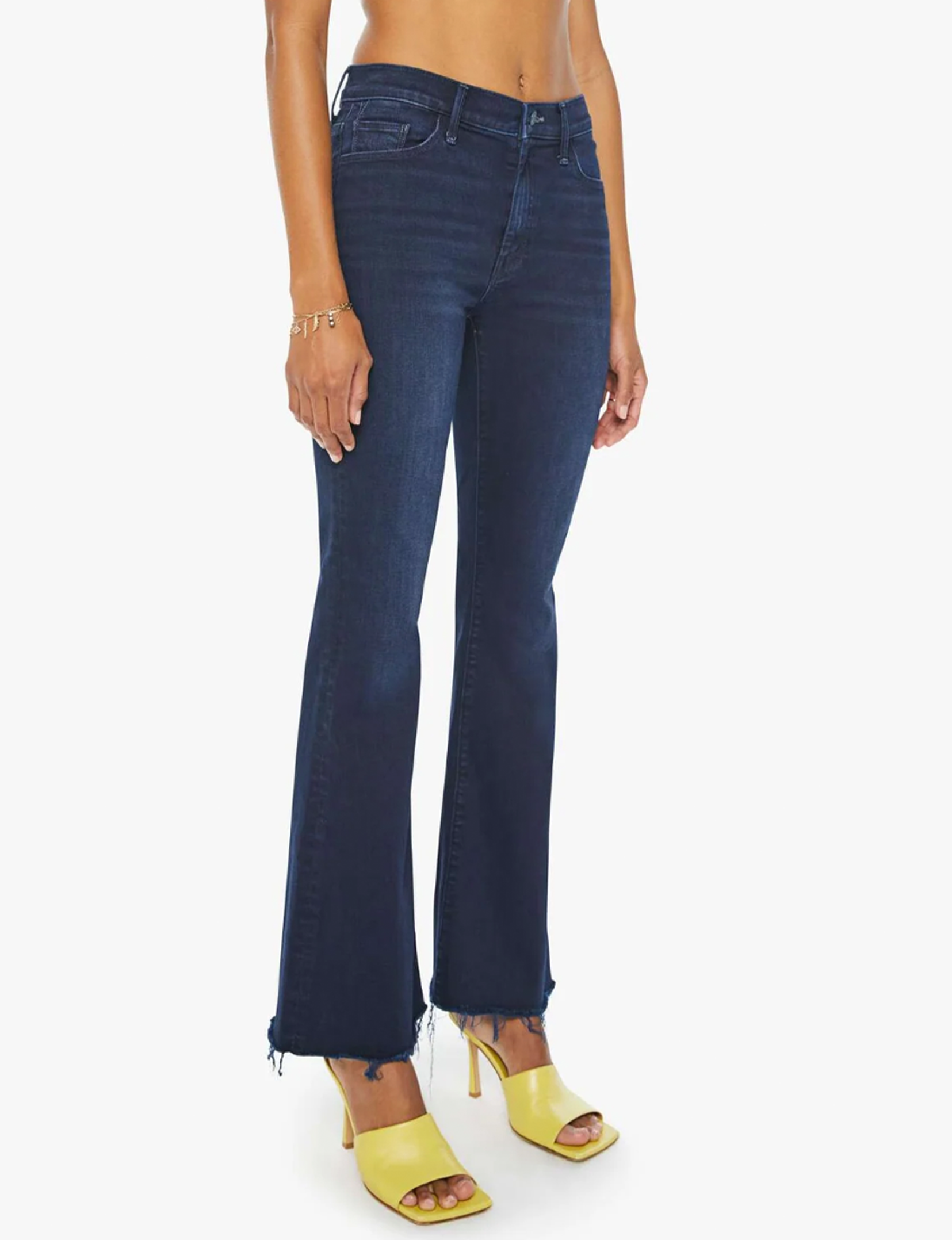 Brush it off. Our most popular mid-rise flare has a 31-inch inseam with a frayed hem. Cut from denim with a touch of stretch, Chip On My Shoulder is a dark blue wash with super subtle fading and whiskering.
