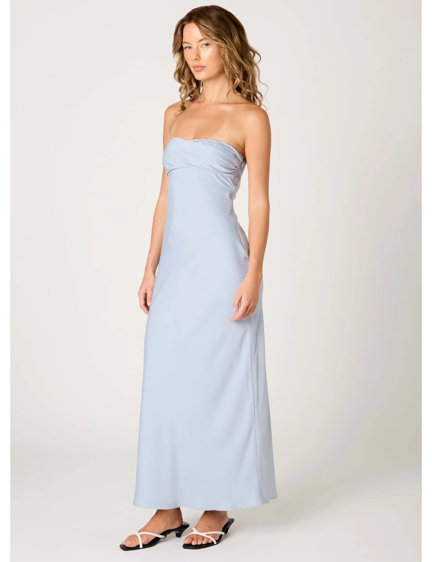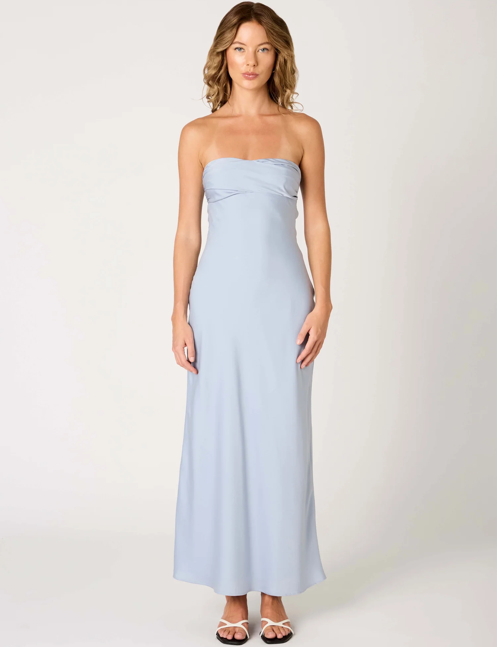 The Tana Dress is a strapless tea-length dress that drapes beautifully on the body. Subtly hugging the curves. The ruched bodice adds slight structure and detailing for a slightly defined feminine shape.