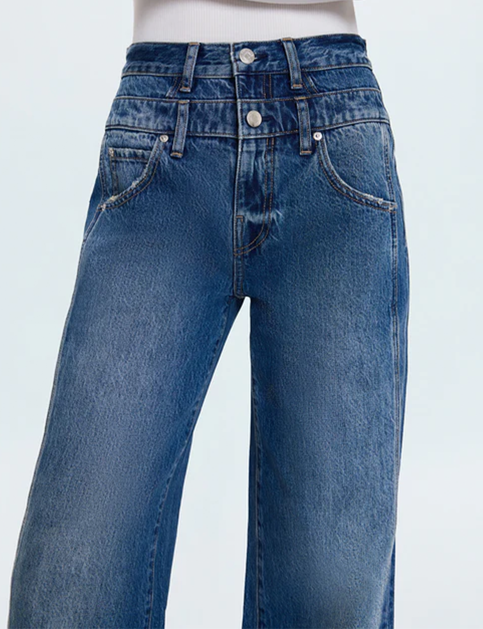 The signature jean that redefines your wardrobe. Caleb sits as a high rise with a wide leg silhouette and full-length 33" inseam that creates effortless drama. Defined by a double stacked waistband and elevated side seam details that add architectural interest. Crafted from rigid denim in Echo, a medium blue wash with clean finishes—no fading, no distressing, just pure intention.