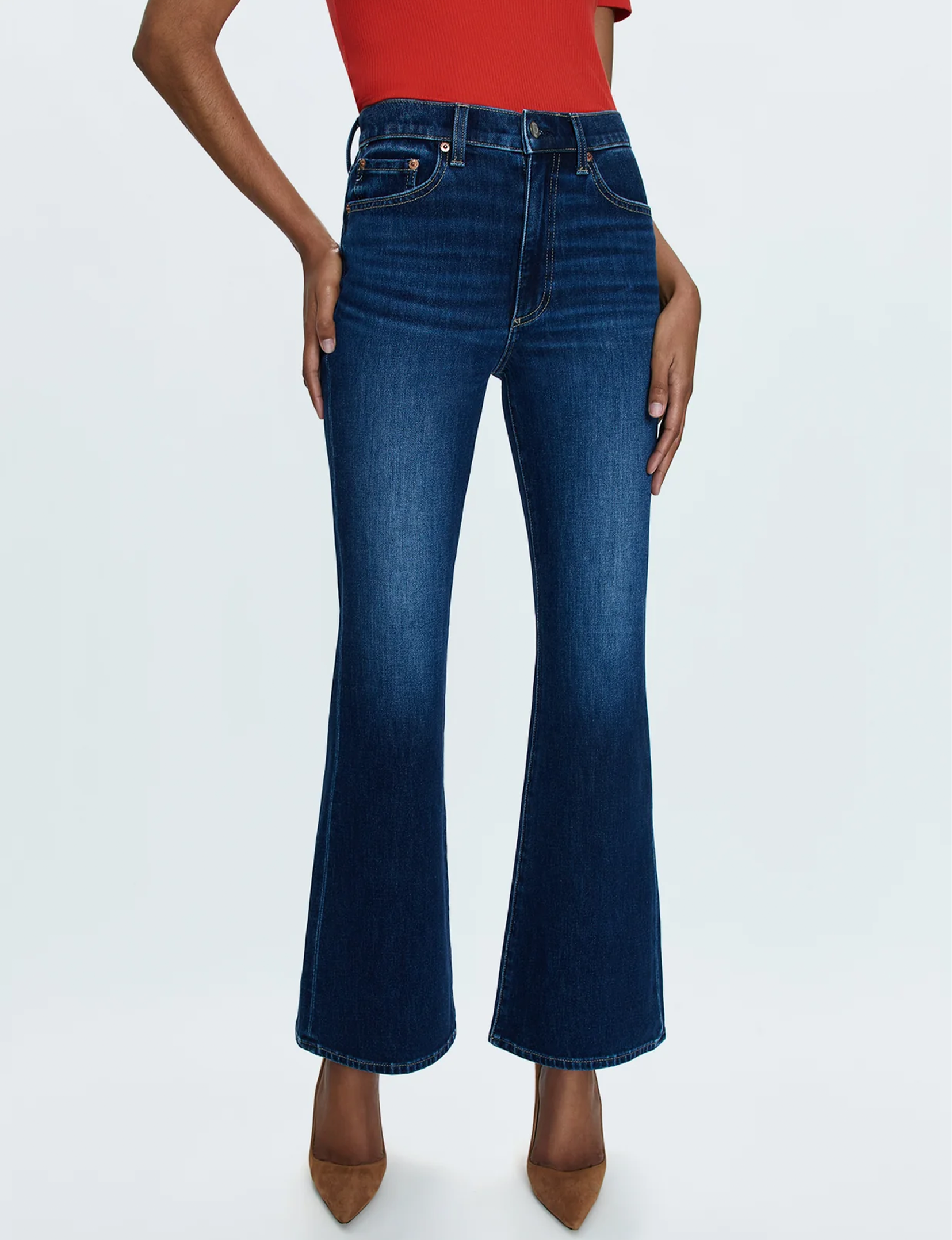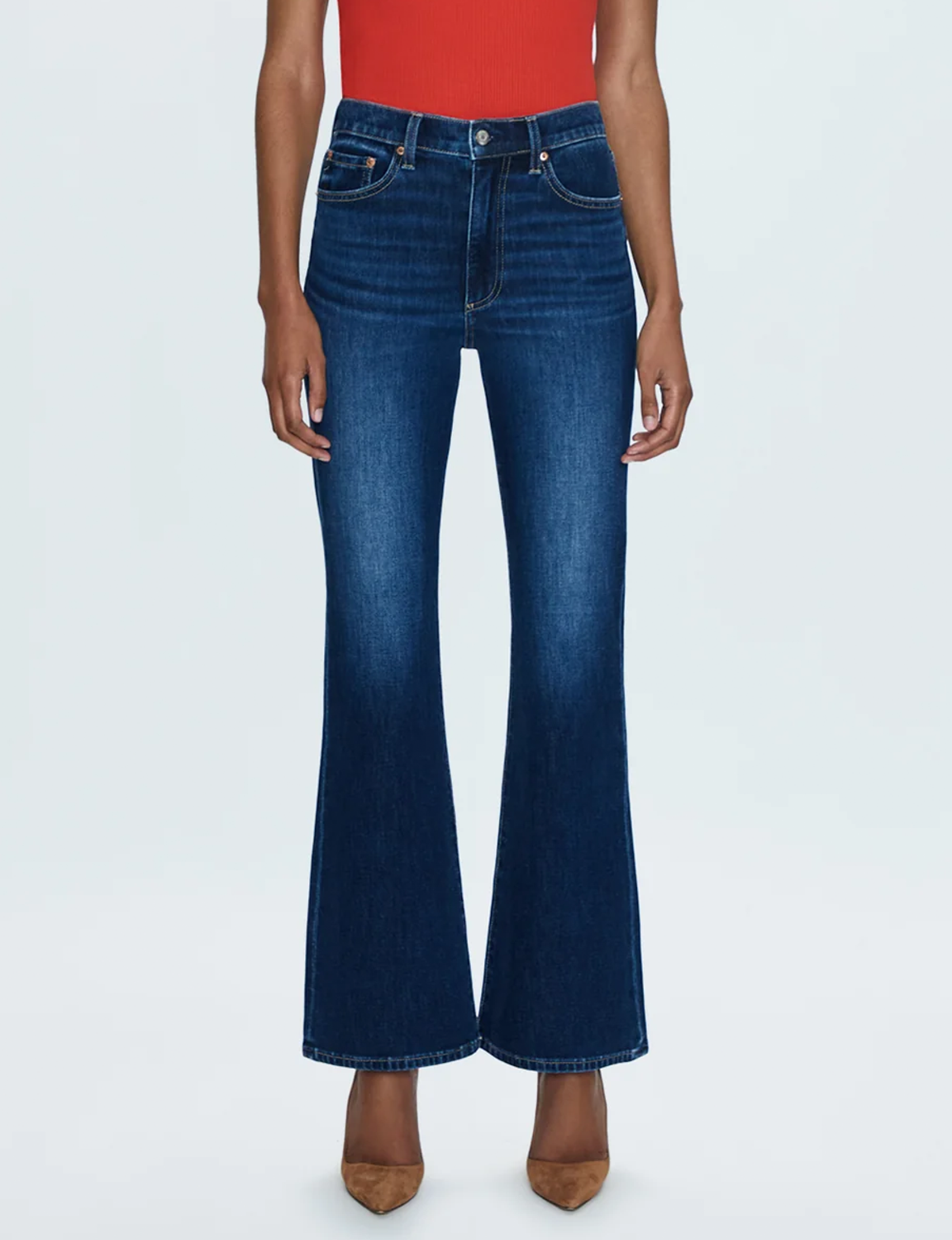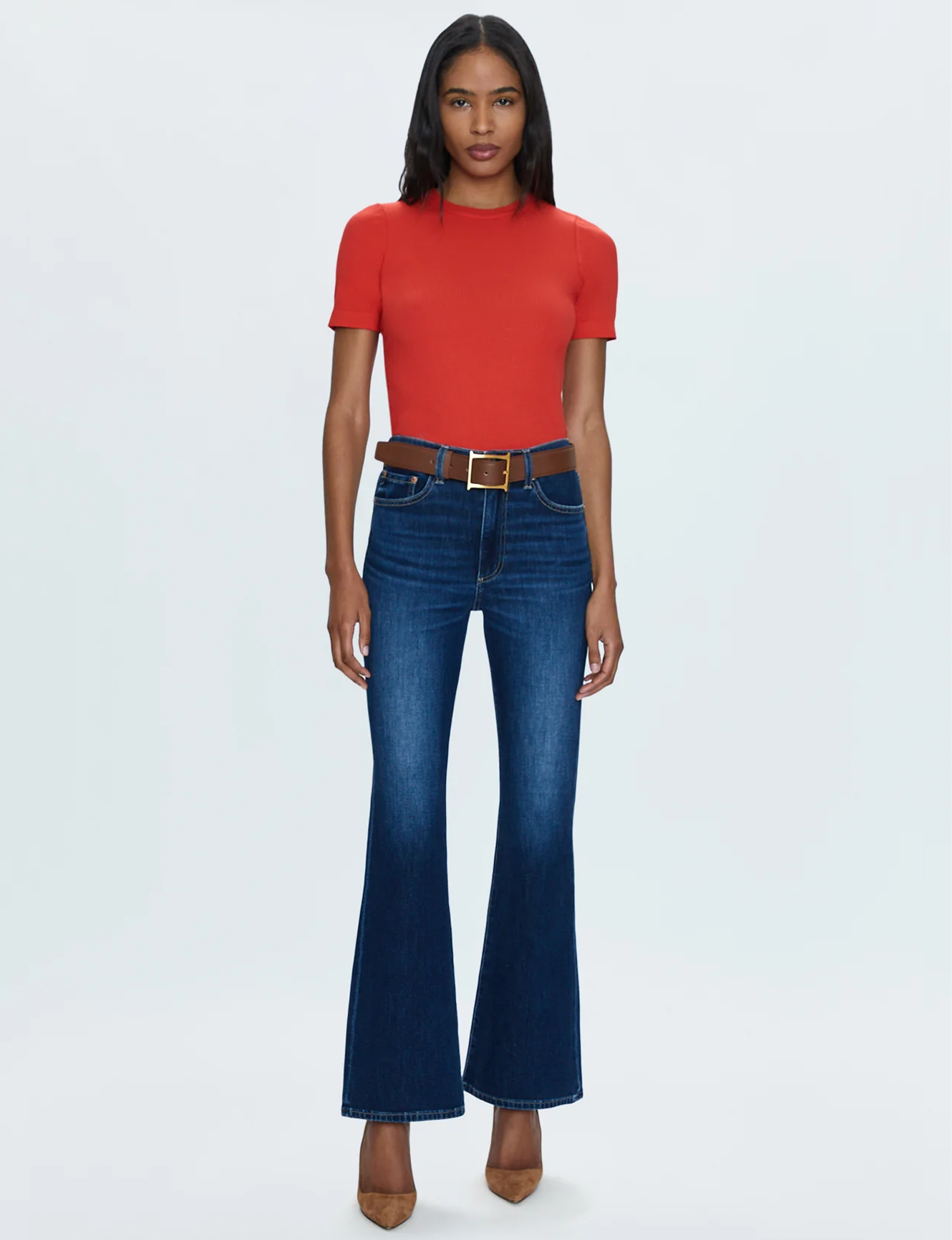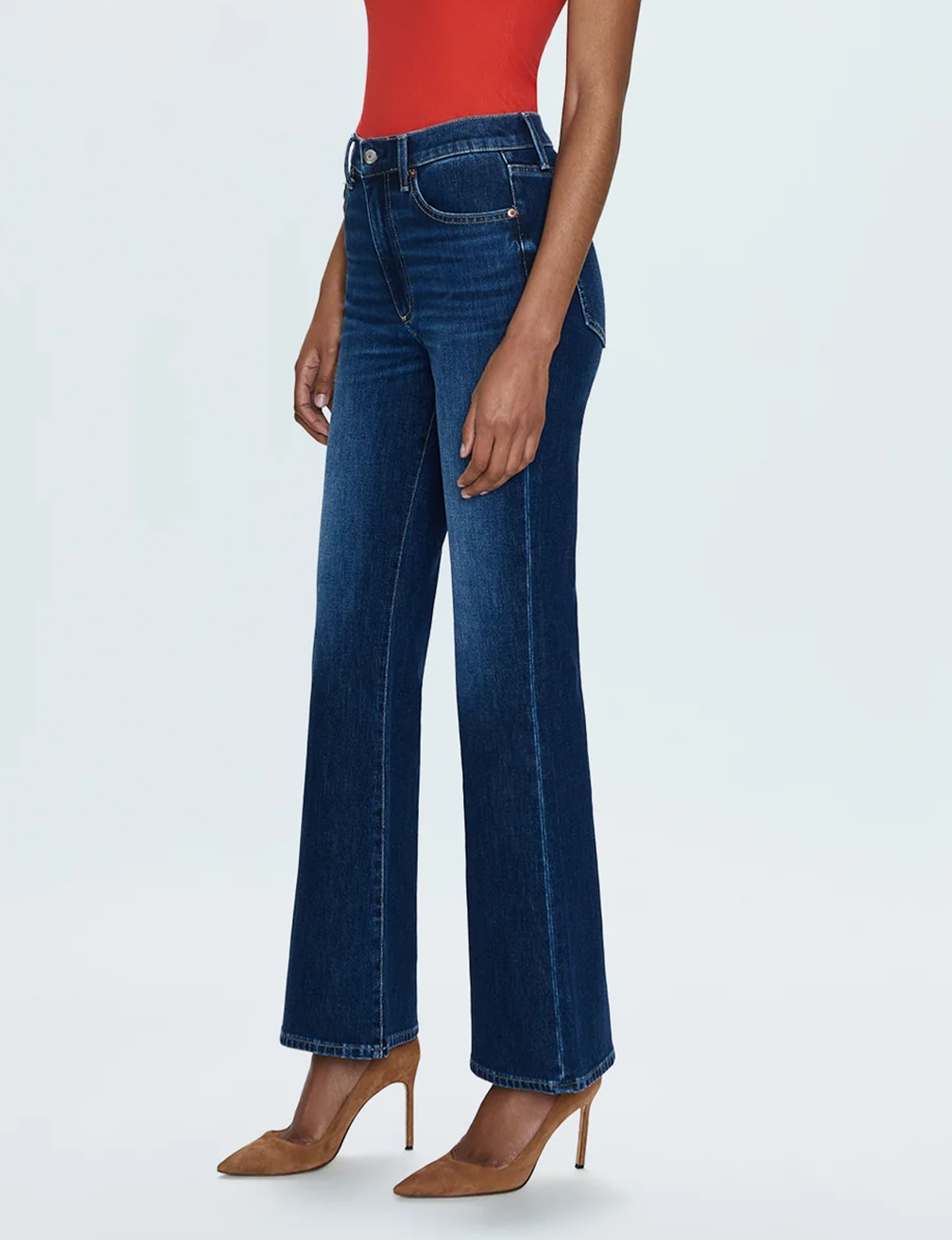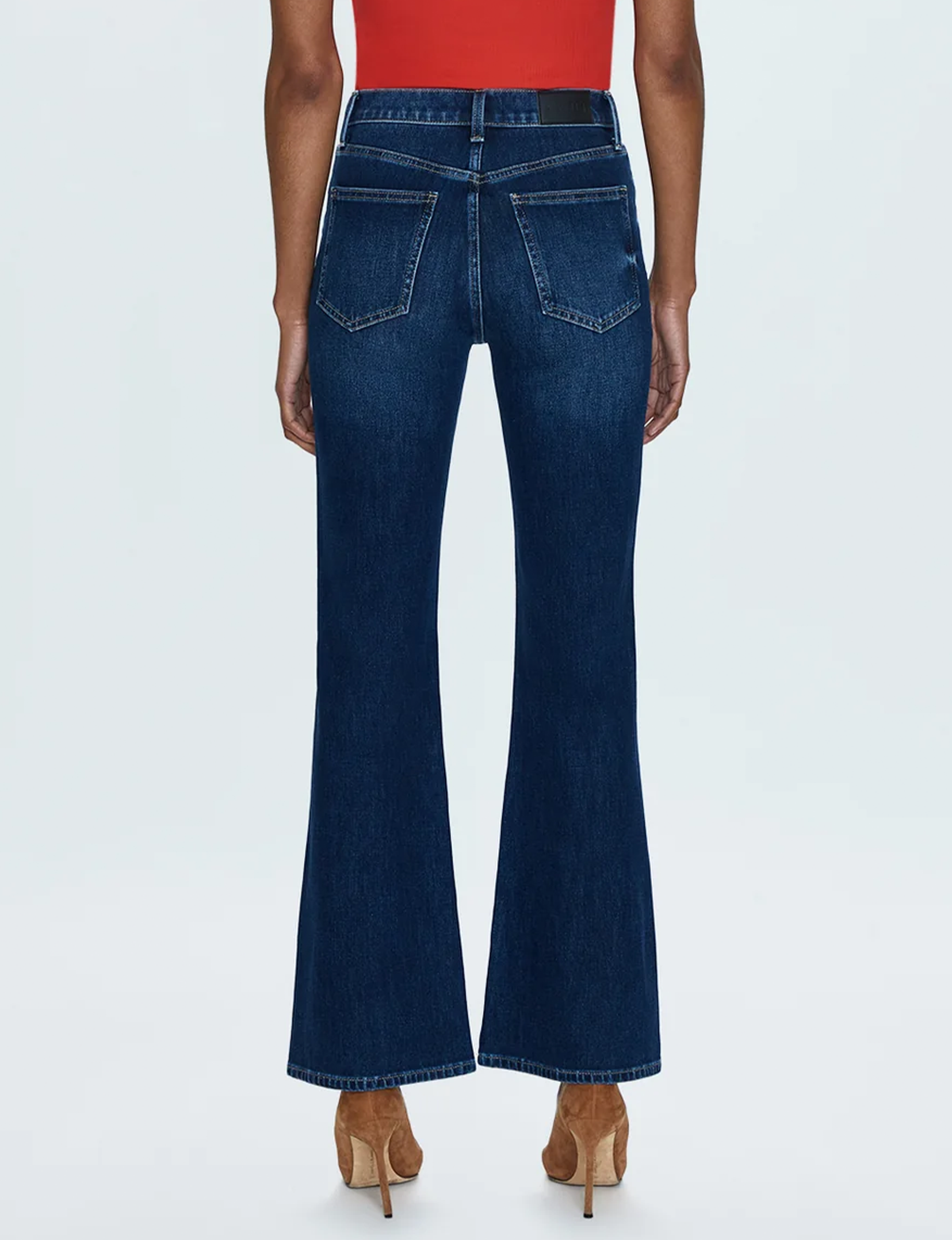 A slimming silhouette, complimented by its figure hugging, comfort stretch denim construction. High rise waist, with a tapered knee that falls to a flared bootcut leg that emphasizes elongated proportions.