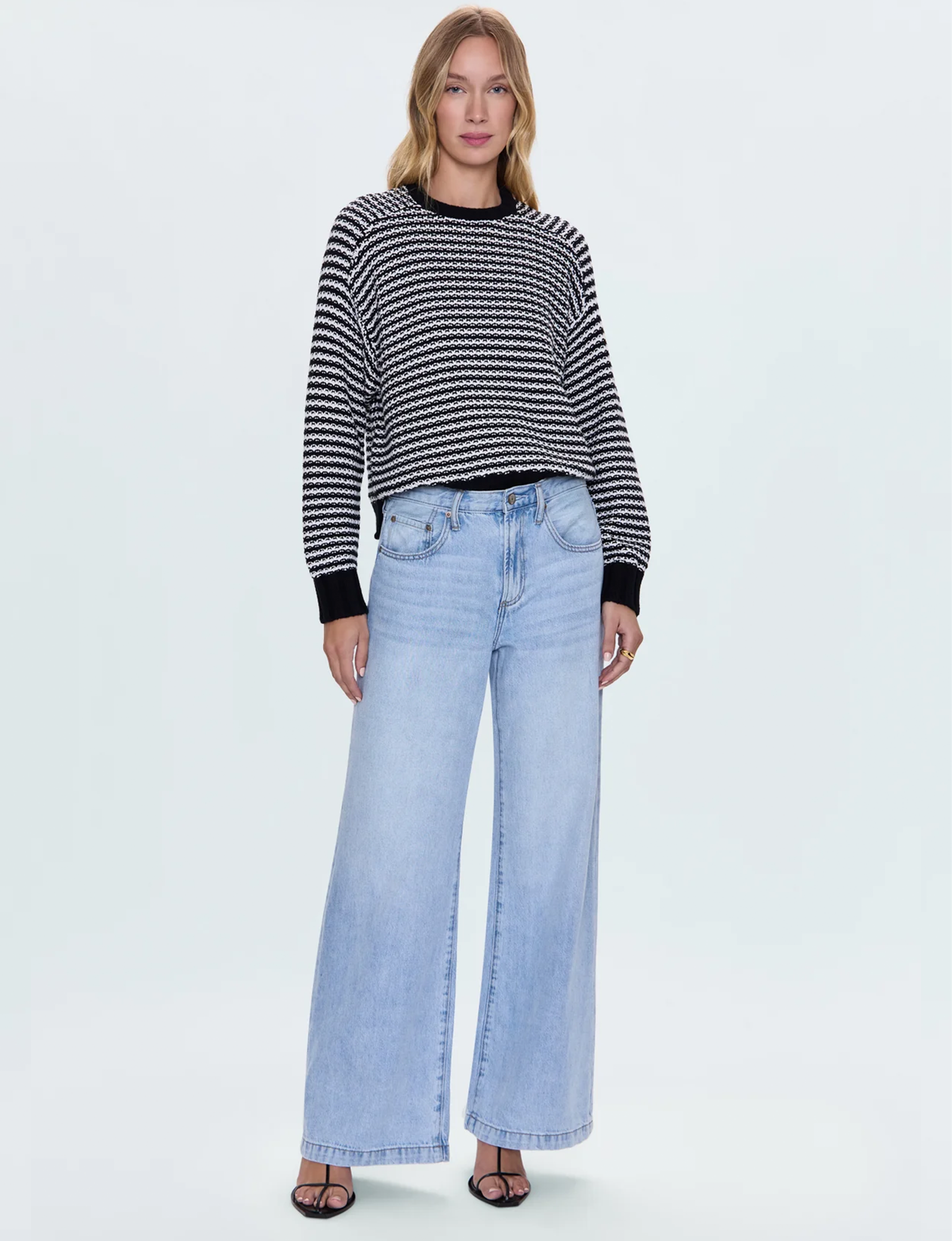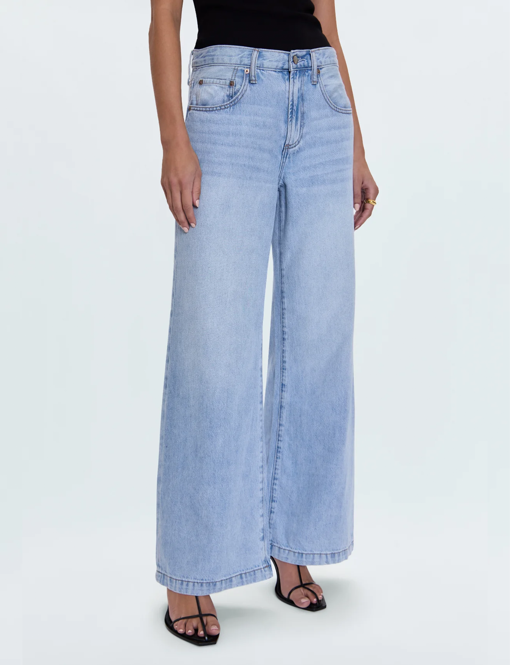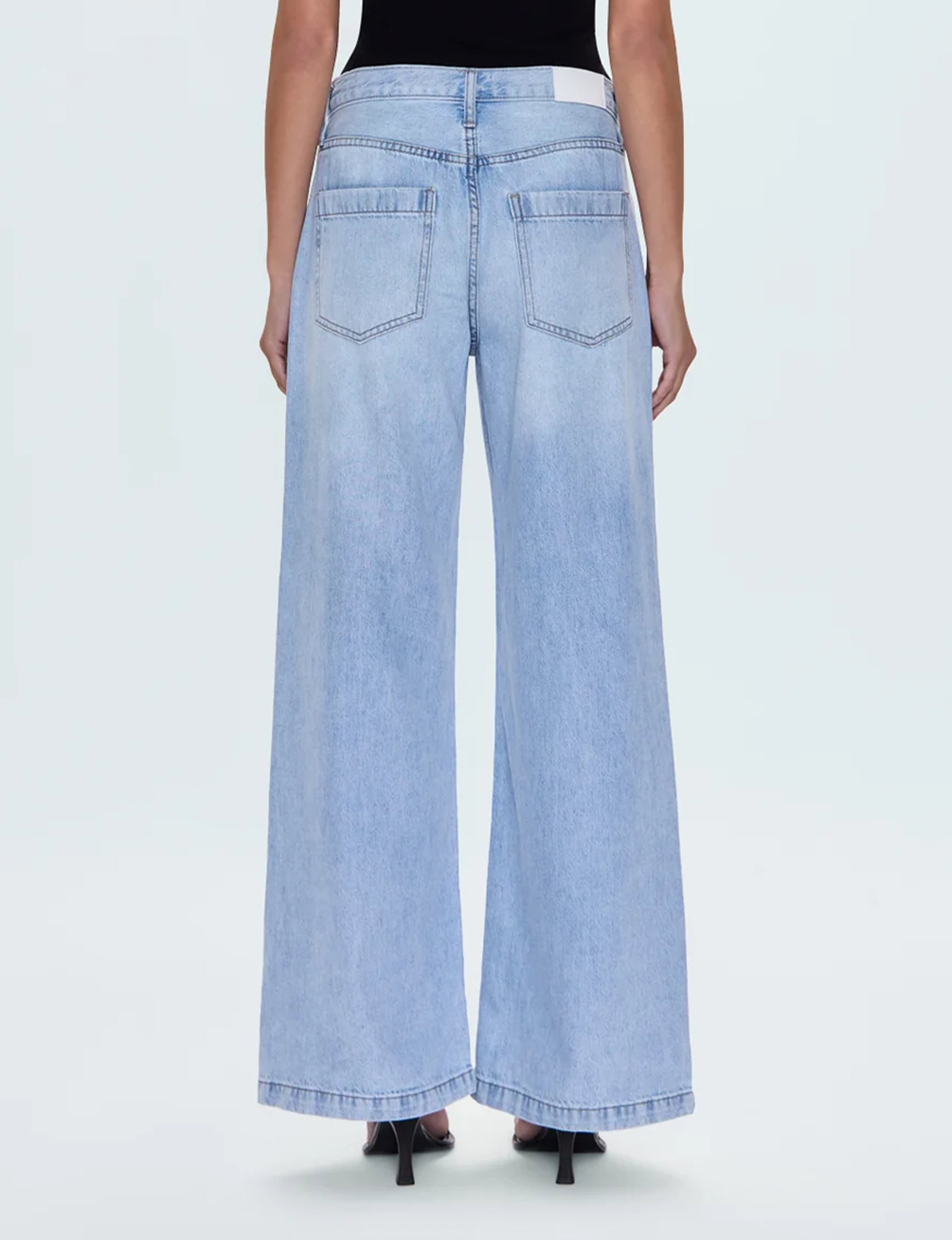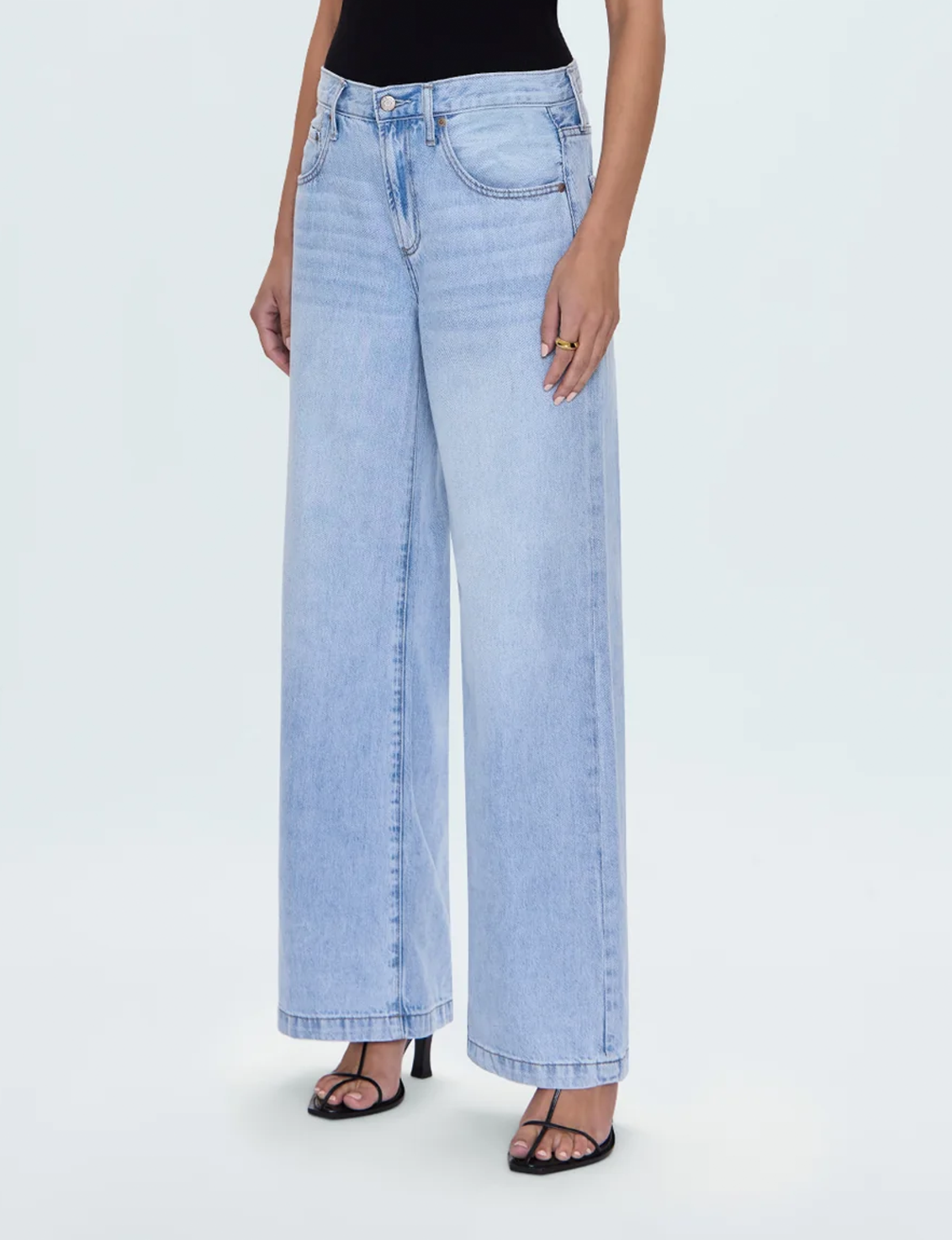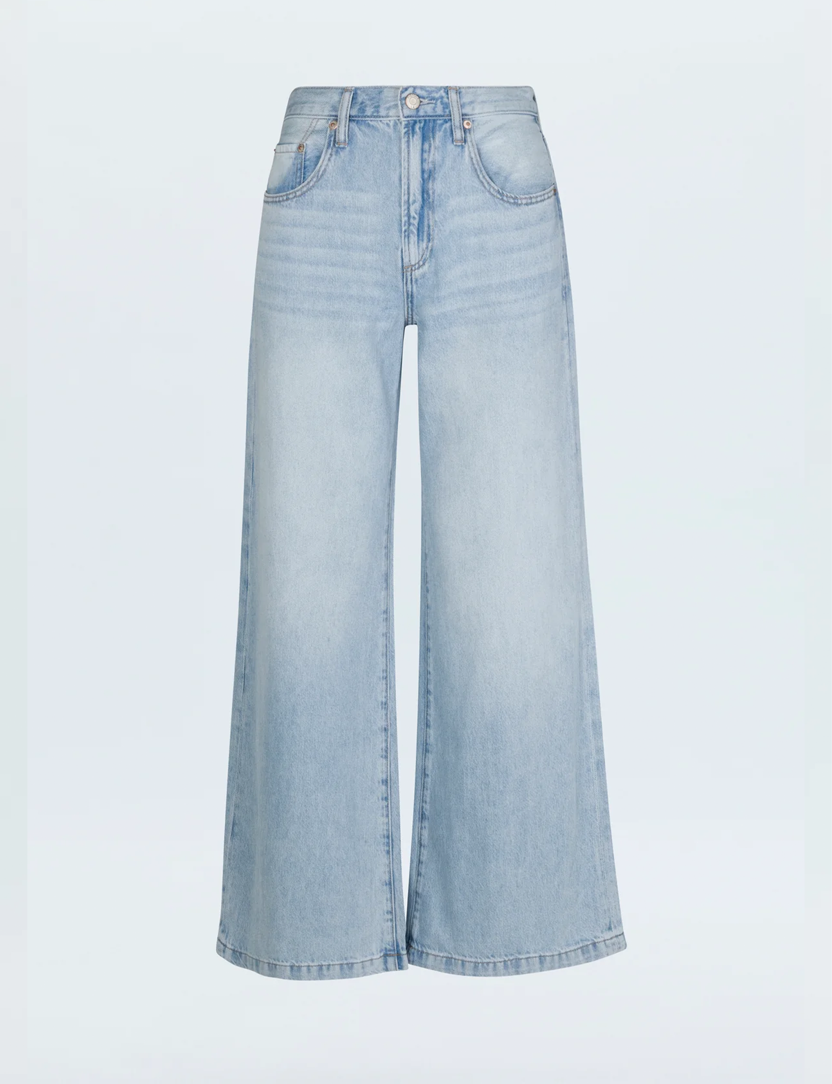 The it-girl fit, designed to sit low on the hips with a relaxed palazzo leg silhouette. Crafted from a lightweight rigid denim and offered in a cool blue light wash with vintage fading and whiskering.