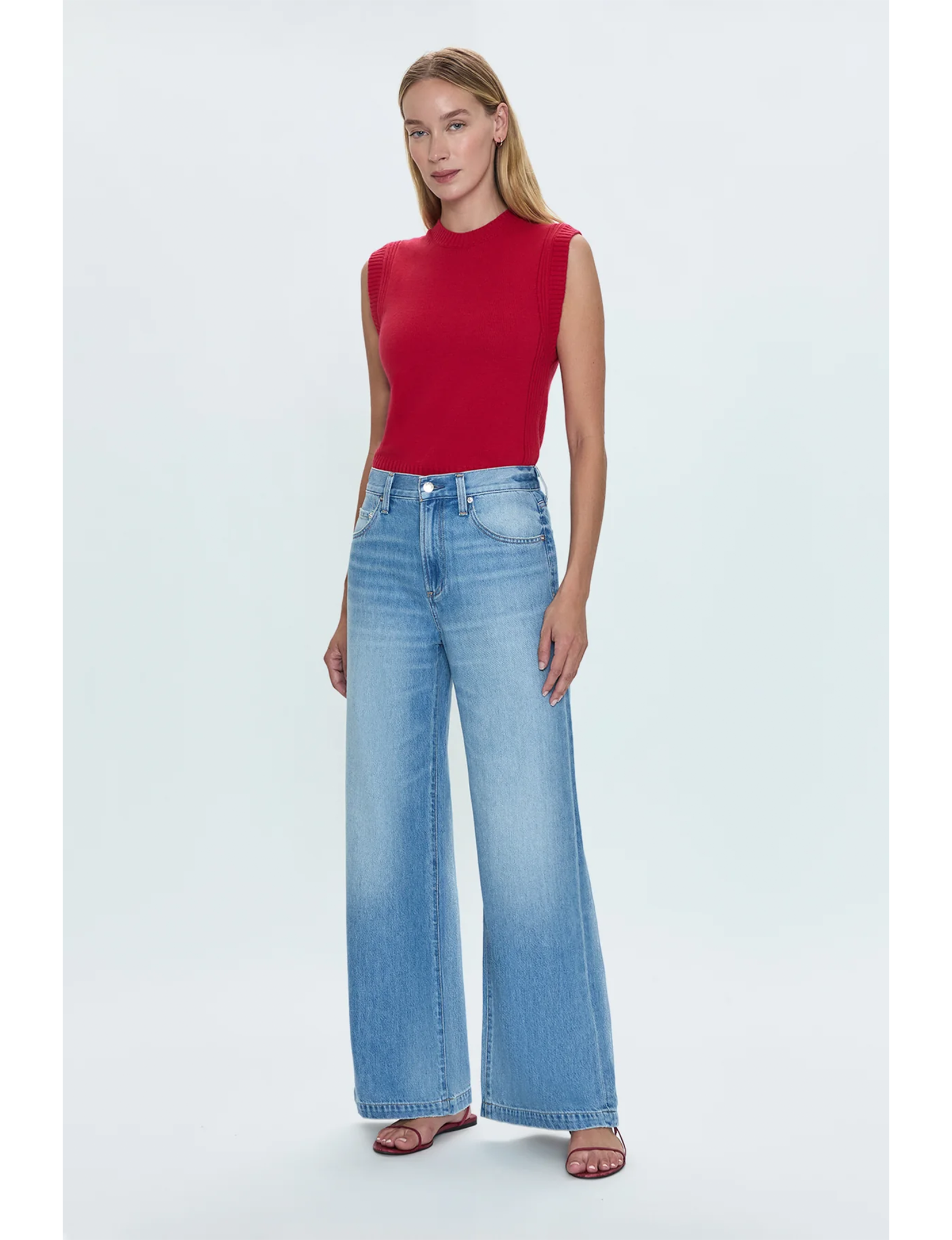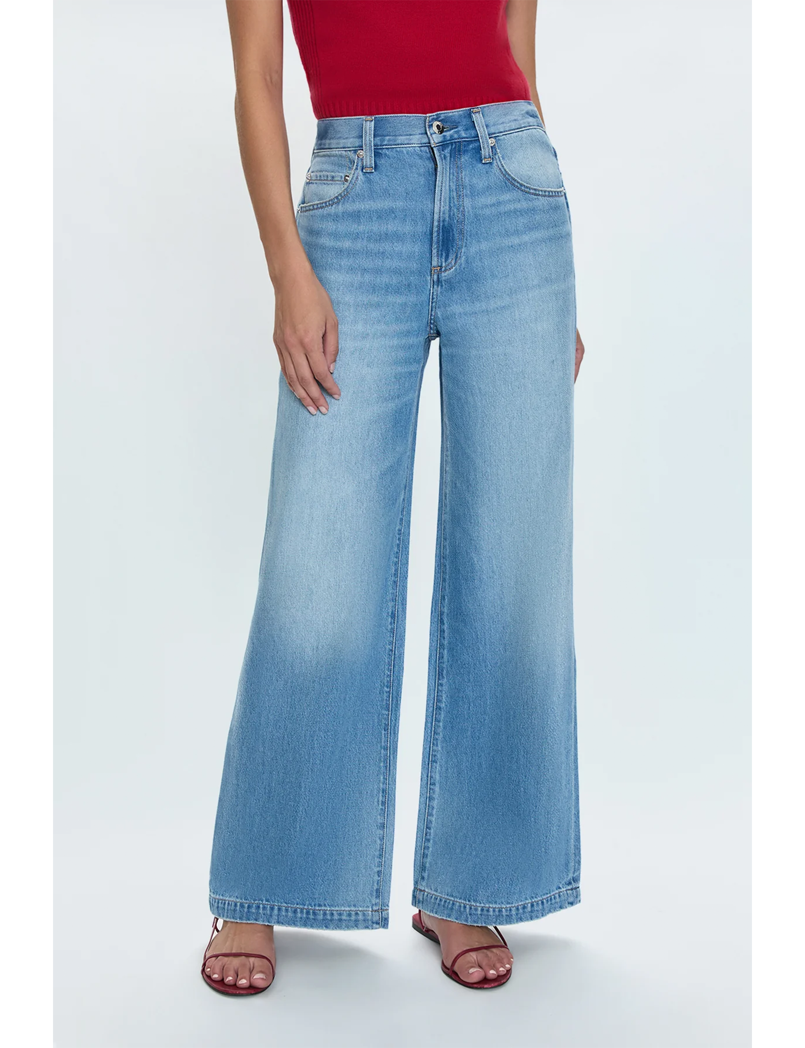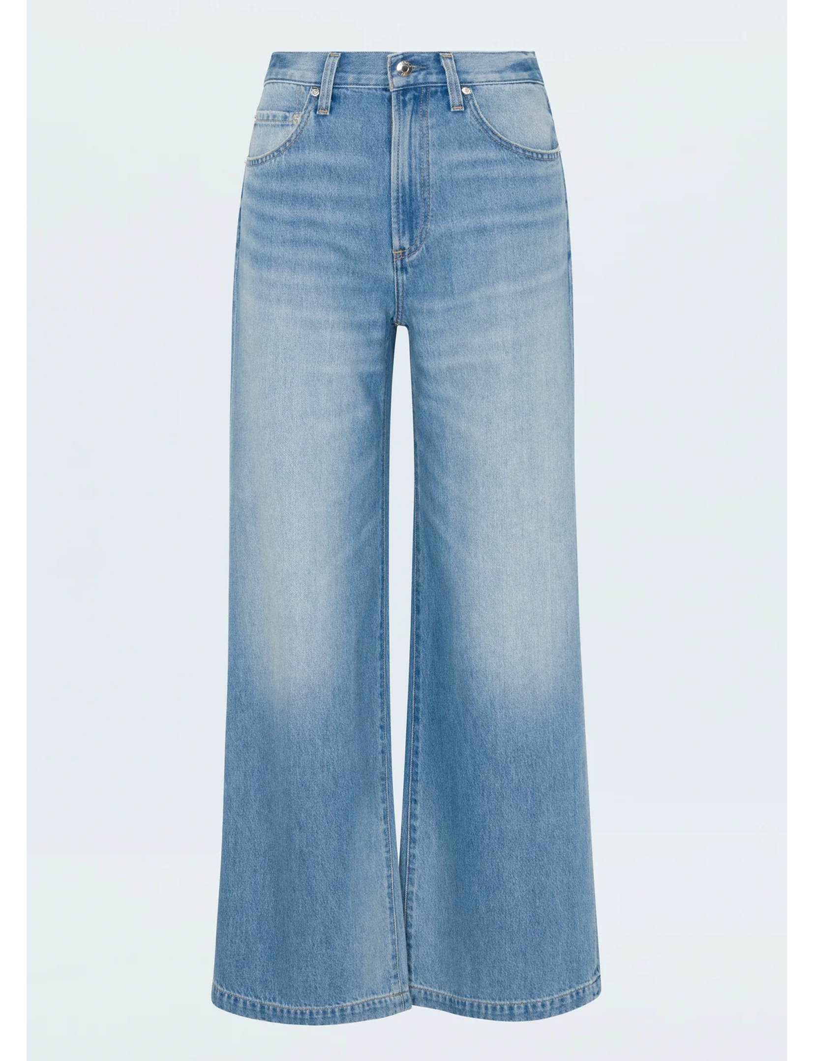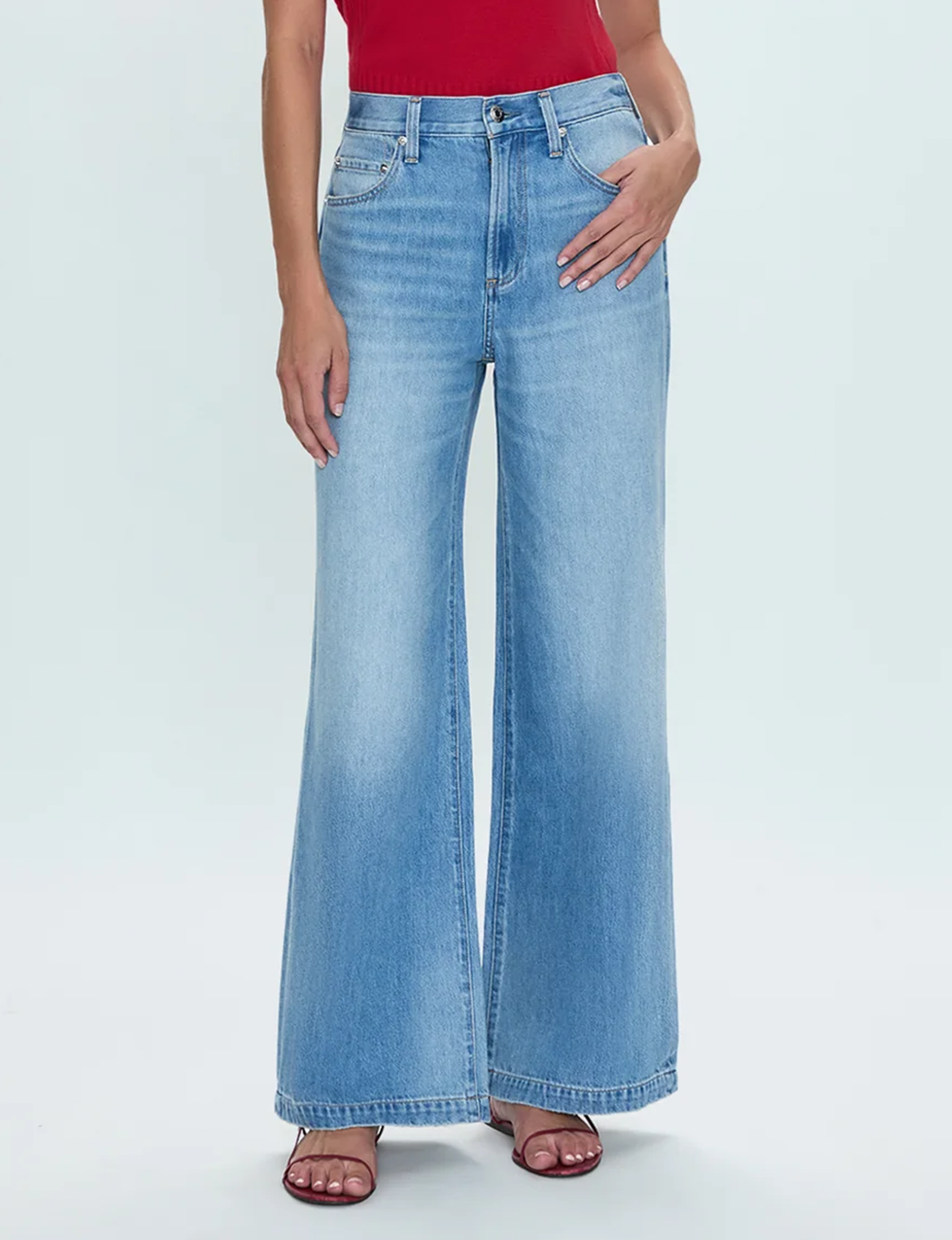 The it-girl fit. Jadyn is designed to sit low on the hips, with a relaxed palazzo leg silhouette. Crafted from a lightweight rigid denim without stretch that holds it shape and offered in a cool blue light wash with dynamic fading and whiskering details.