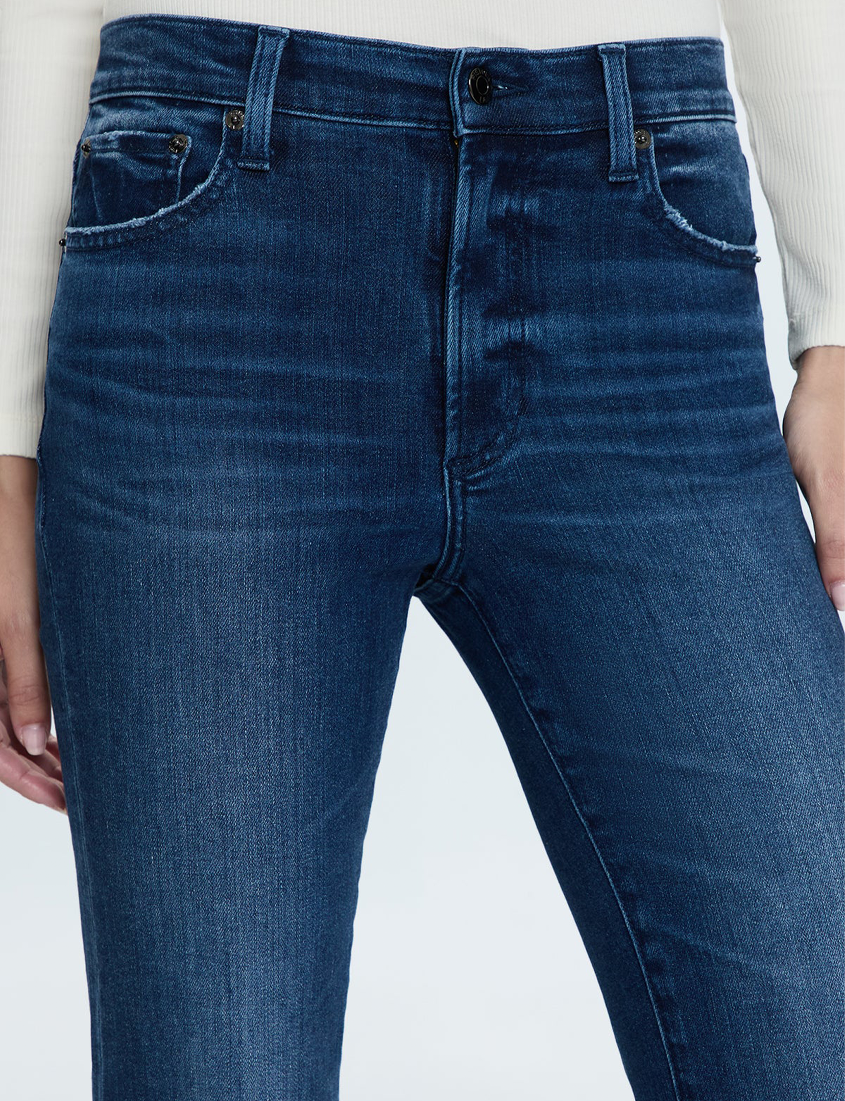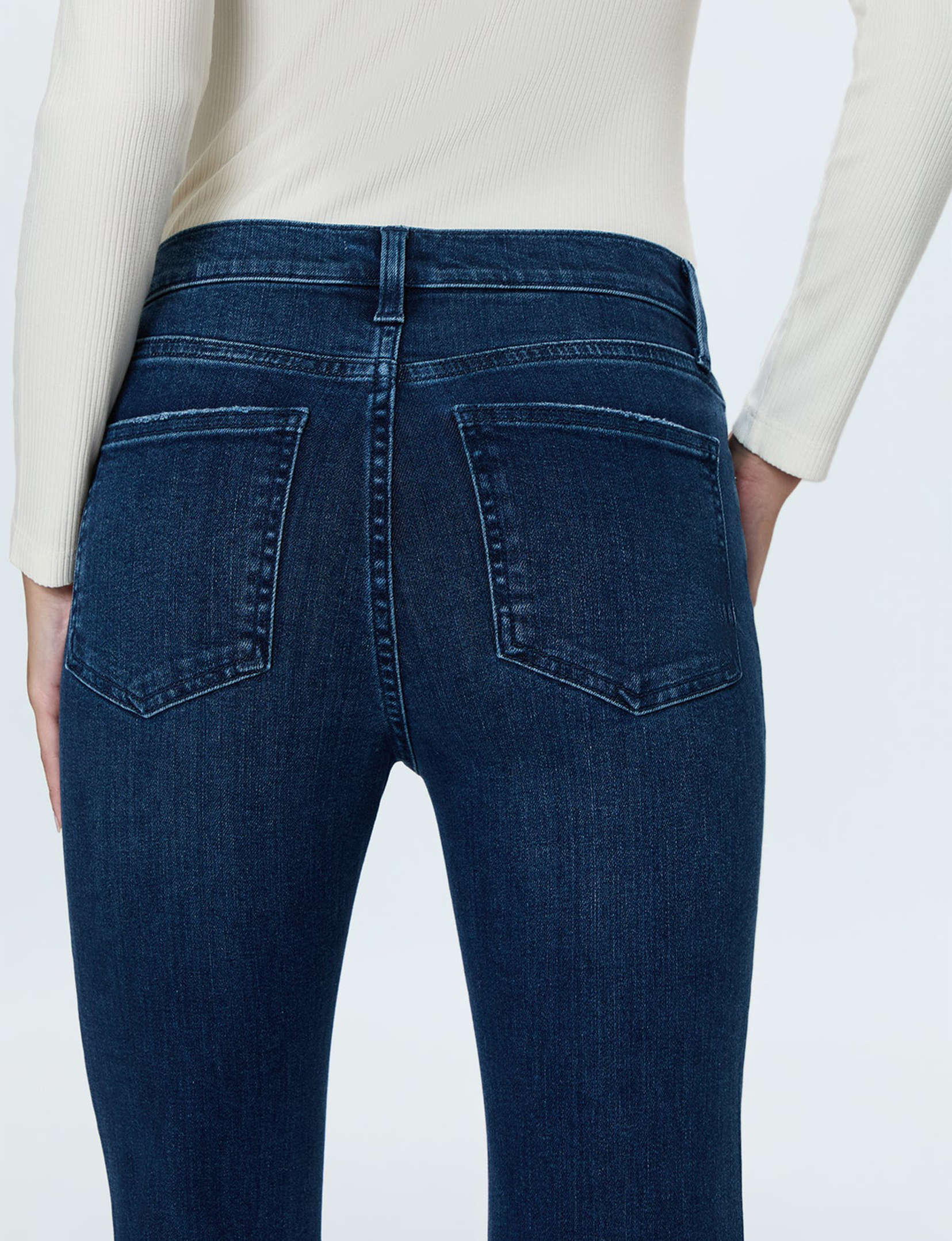 Mid rise waist with a sophisticated ultra-flared leg opening for unquestionably slimming proportions. Crafted from our signature comfort stretch denim. Modern is a deep blue dark denim wash with tonal stitching and gunmetal hardware.
