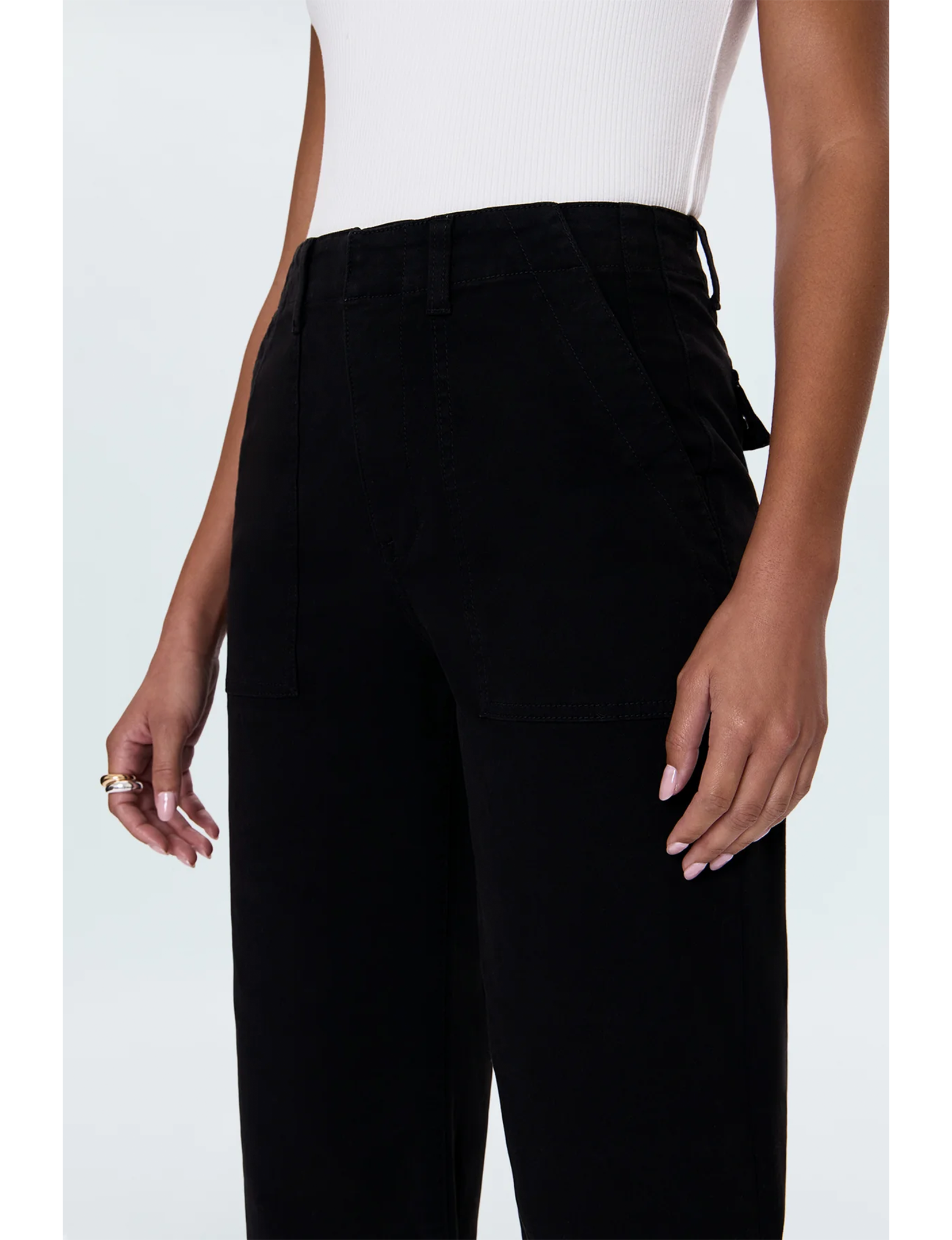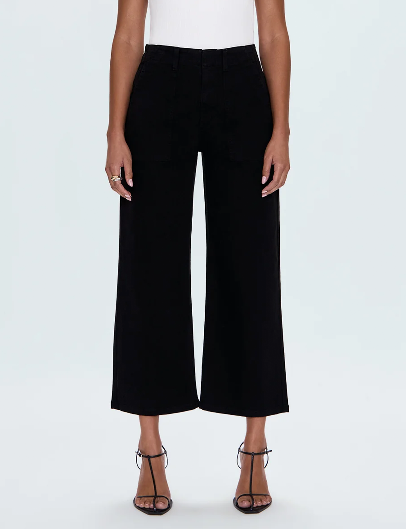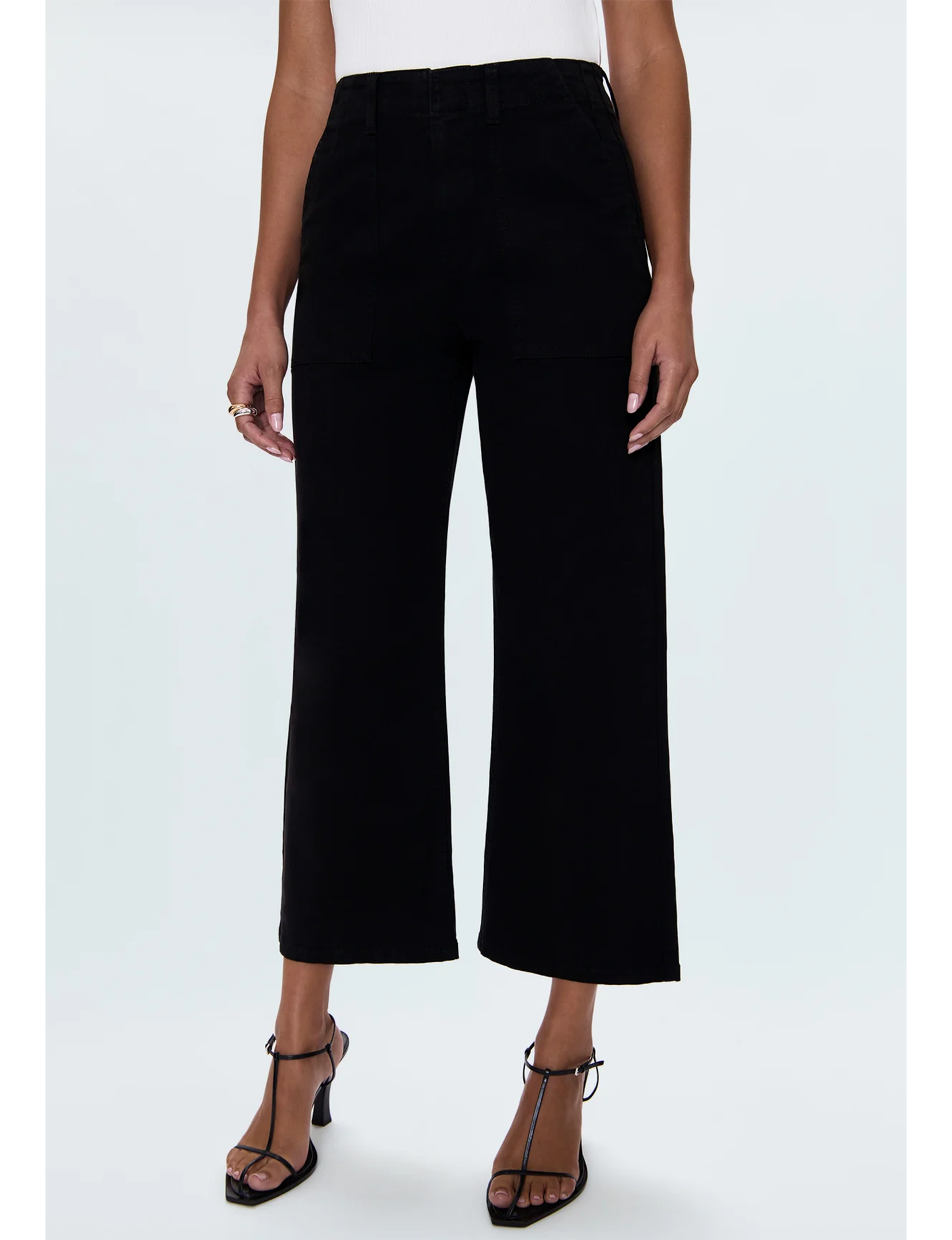 Relaxed, wide leg silhouette with a cropped, ankle length hem. Patch front pockets with seaming and button flap back pockets nod to utility design inspiration. Sophia is crafted from a comfort-driven trouser fabrication with stretch.