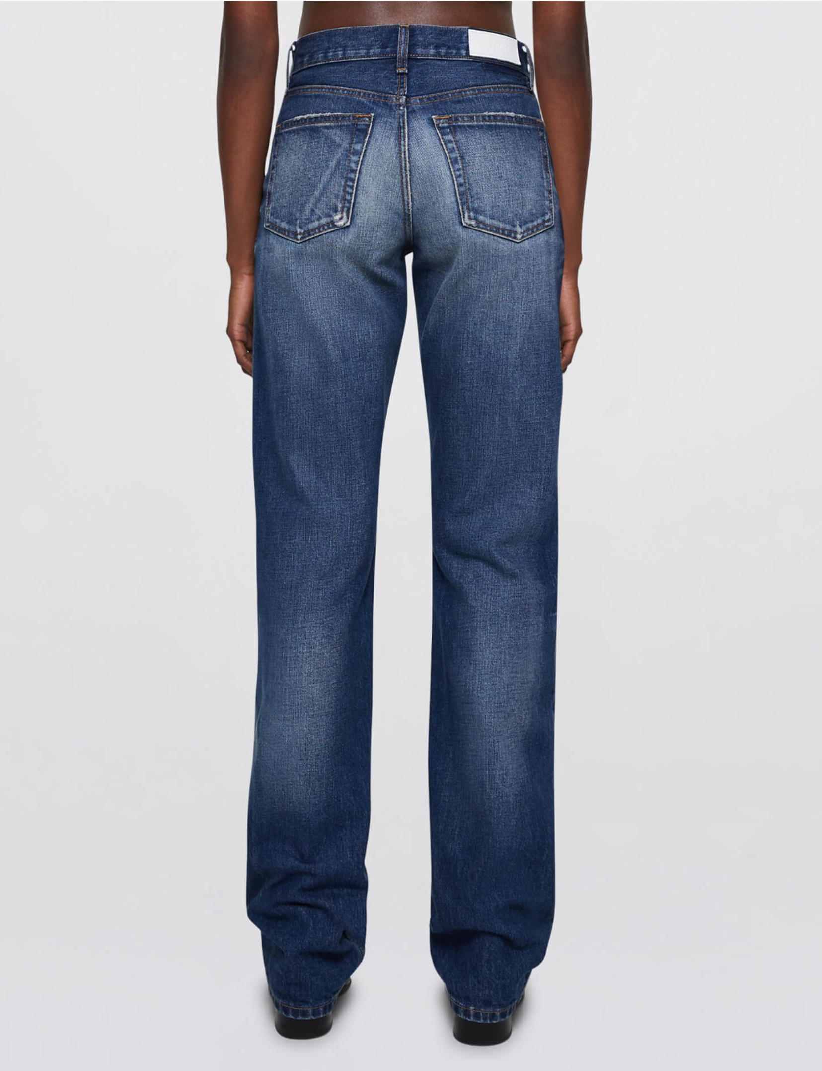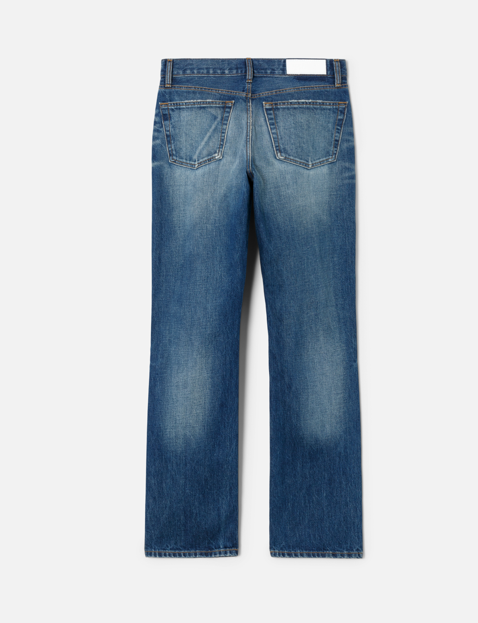 Mid-rise, relaxed leg, long full length inseam meant to stack. Features a destroyed whiskered wash on vintage 60s inspired rigid fabric, classic button fly and finished hem.