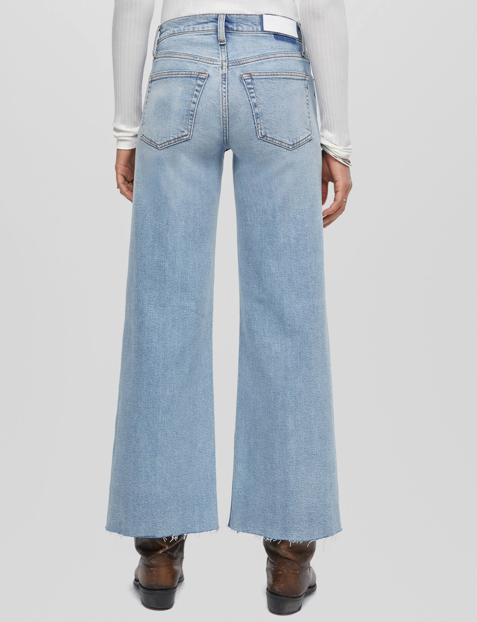 A clean mid rise with a wider leg opening. Features a vintage inspired stone wash on comfort stretch denim, classic button fly and a cut off hem.